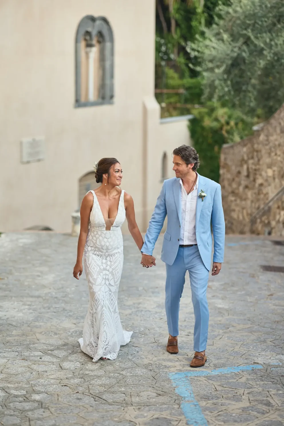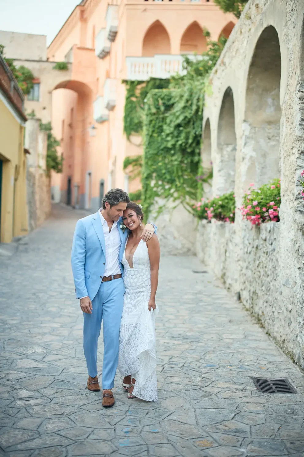 After exchanging vows, they wandered the quiet streets of Ravello, using the town’s distinct architecture and cascades of bougainvillea as the backdrop for their first portraits as husband and wife. The day ended as it began: together, on their terrace, with a lovely private dinner as the sky darkened over the water.