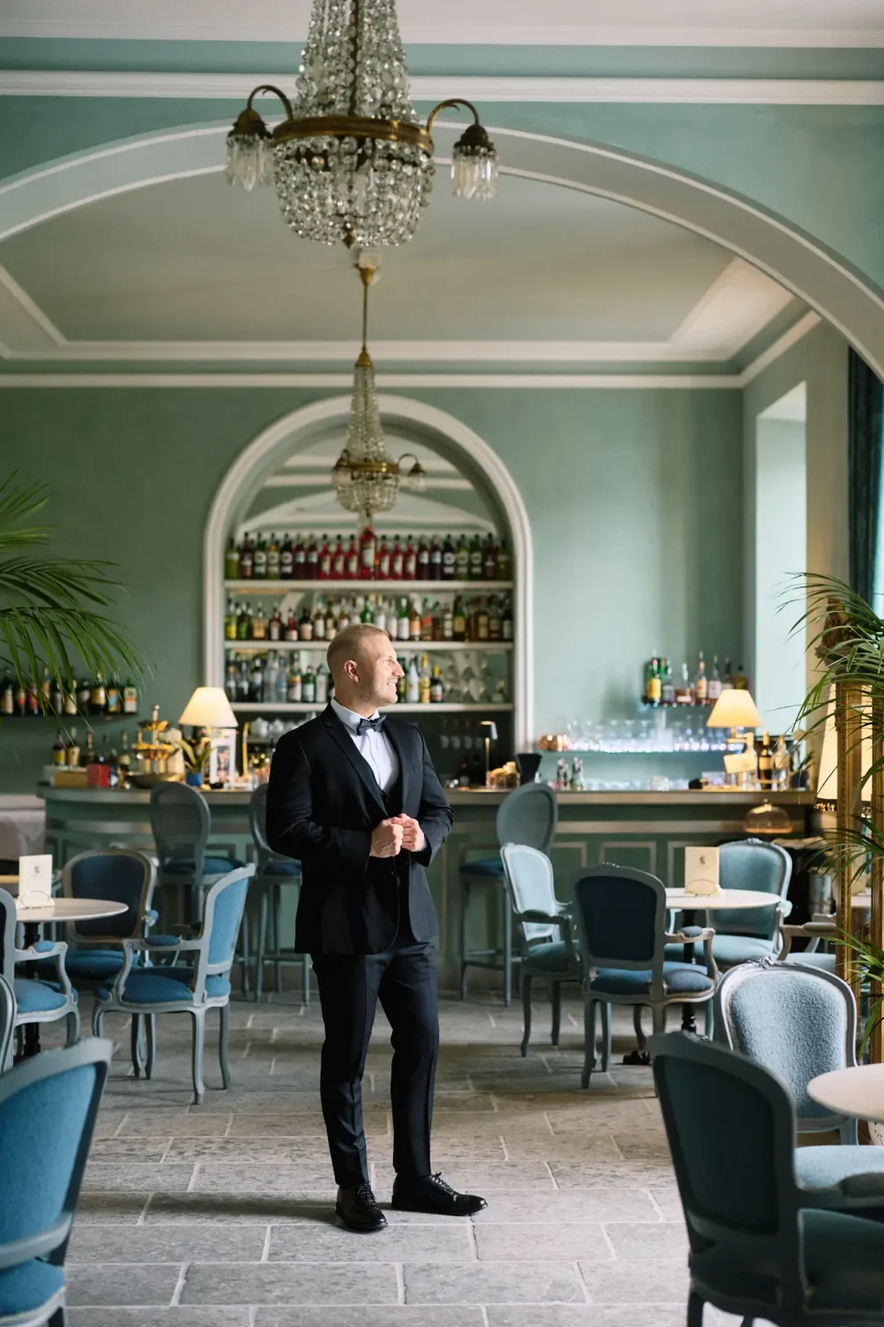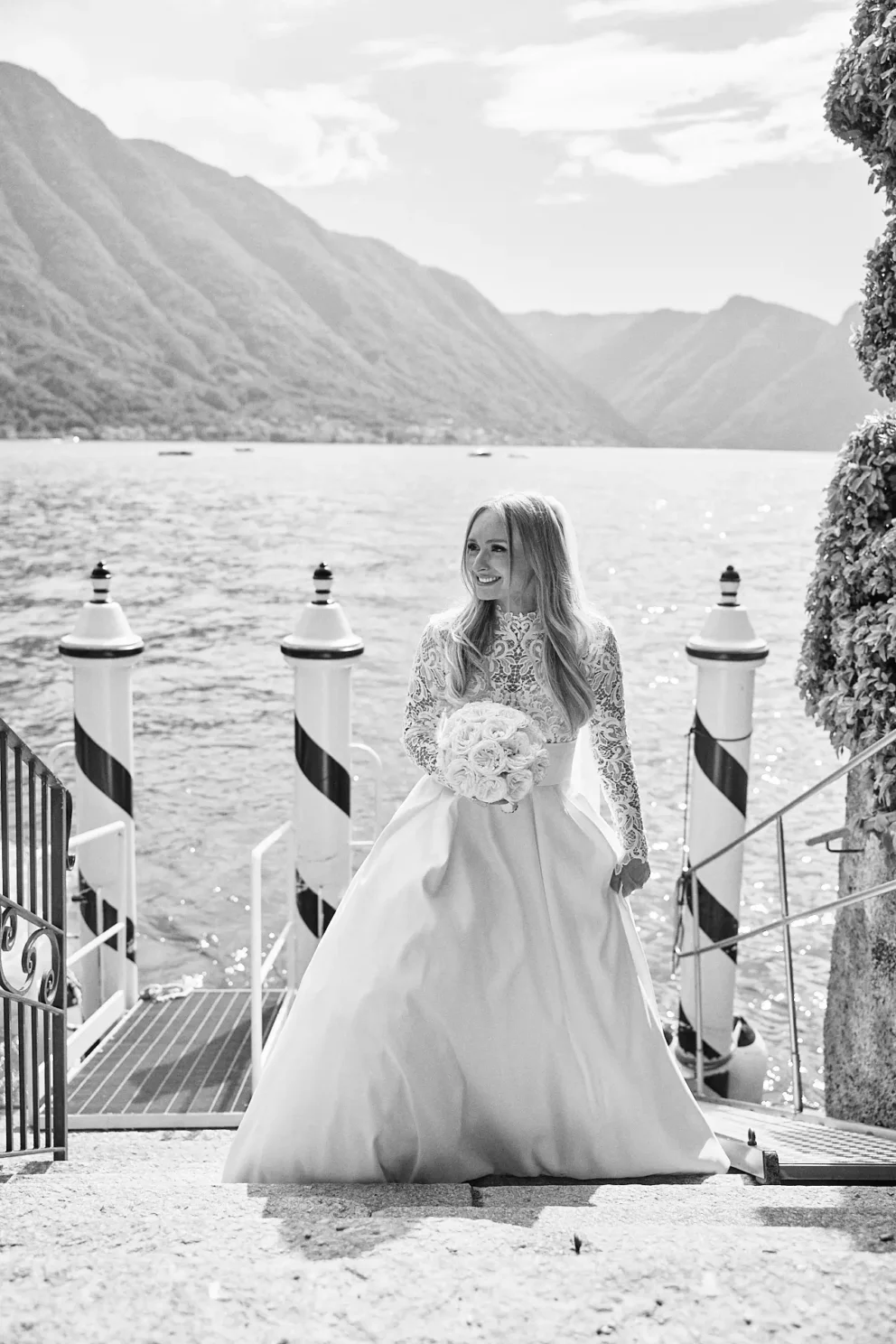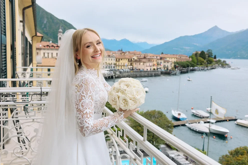The day began at the Grand Hotel Menaggio, with Brendan getting ready in the hotel’s classic bar. Later, Juliana had her own quiet moments on her private balcony, the soft spring light perfect for portraits. Their first look happened by the lakeside pool, a completely private moment before the day’s adventure began.
