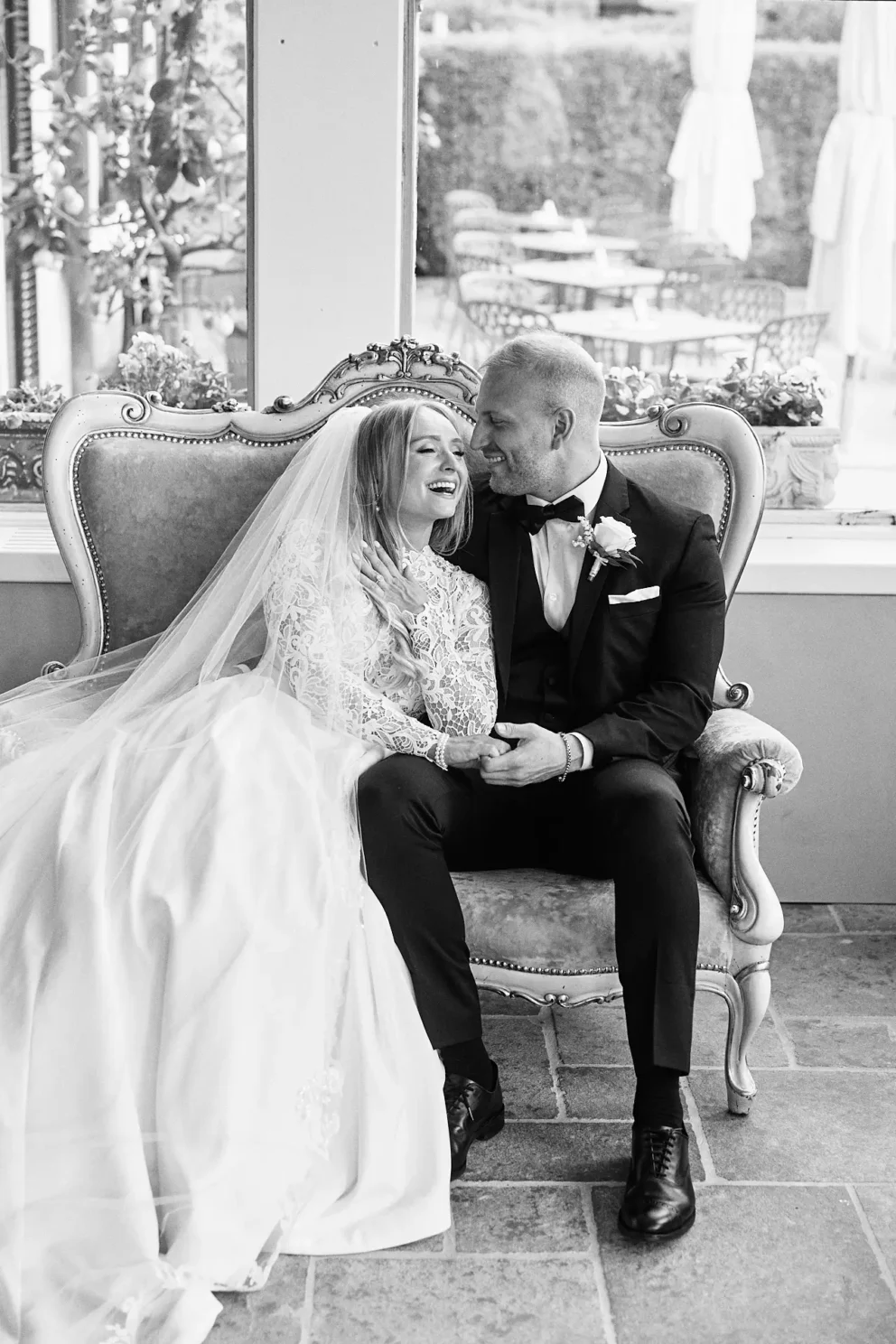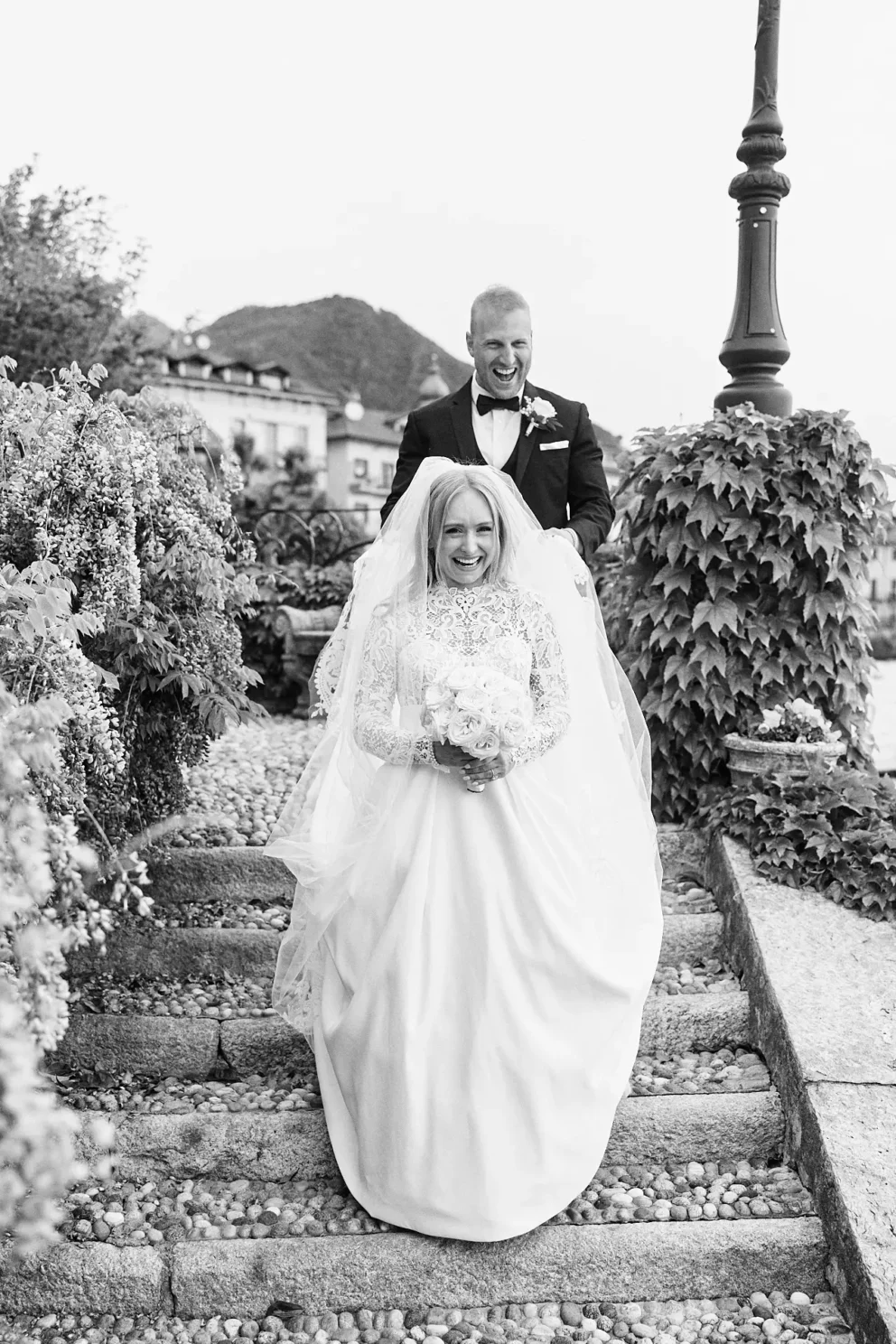 This is where the day becomes pure celebration. With prosecco in hand, they took turns piloting the boat, creating photographs that are full of life and motion against the backdrop of the Alps. They returned not to Menaggio, but to the Grand Hotel Victoria, where aperitivi were waiting in a private bar. As the sun came out, they moved into the gardens for a few final portraits before their intimate dinner.