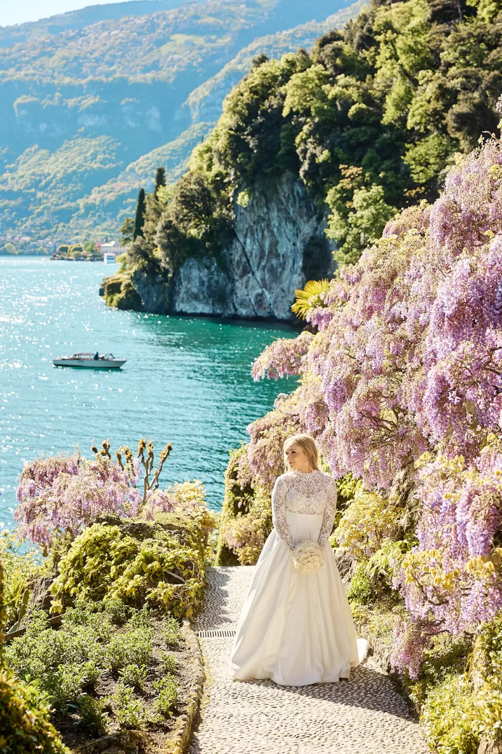 Under those arches, surrounded by cascades of purple wisteria, they exchanged their vows. April at Balbianello is different. The air is cooler, the grounds are quieter, and you get the distinct feeling that this world-famous garden belongs only to you for a little while. After their ceremony, we had planned a one-hour boat tour.