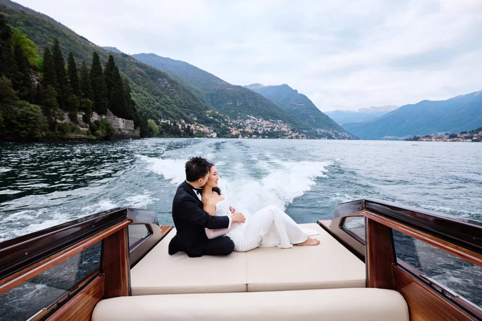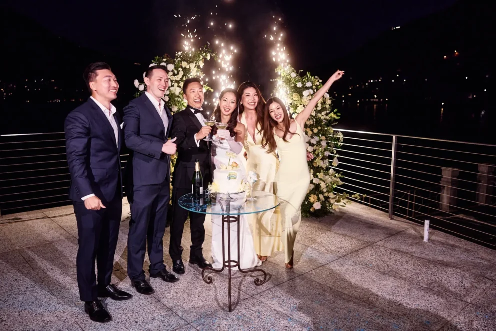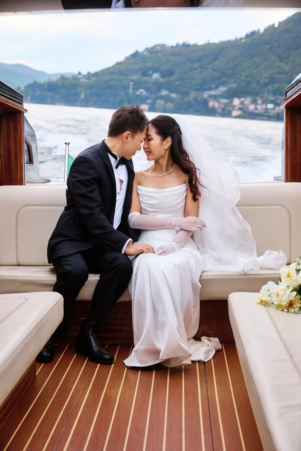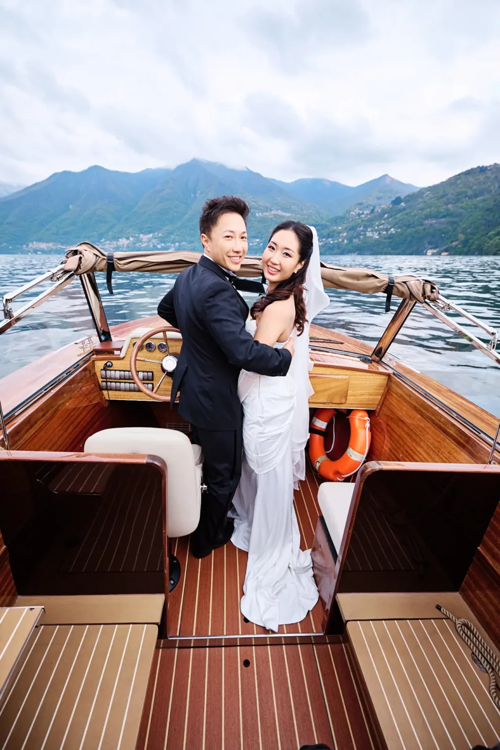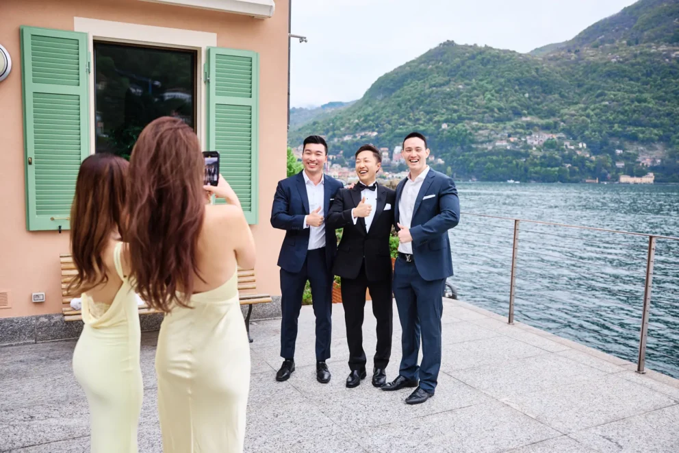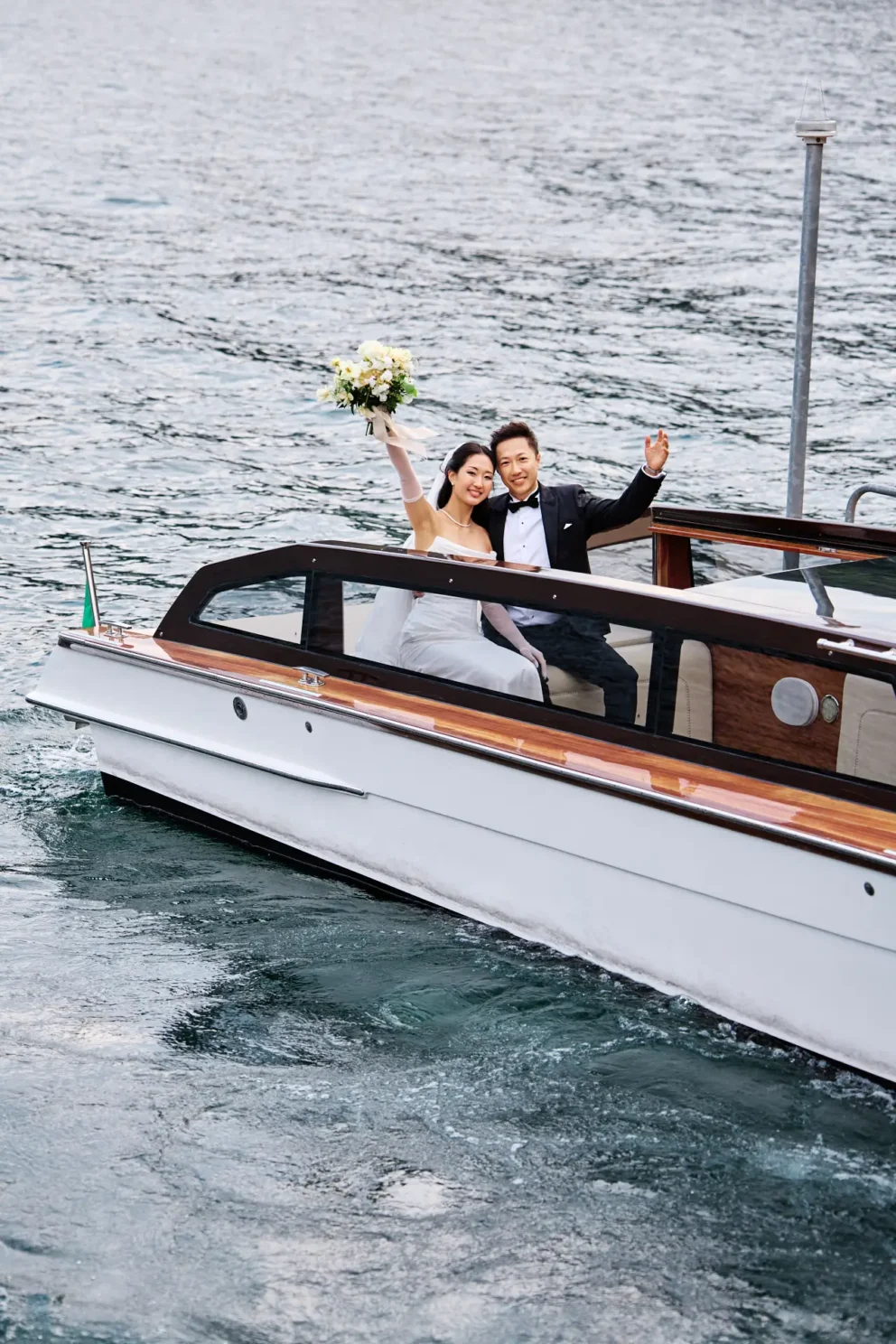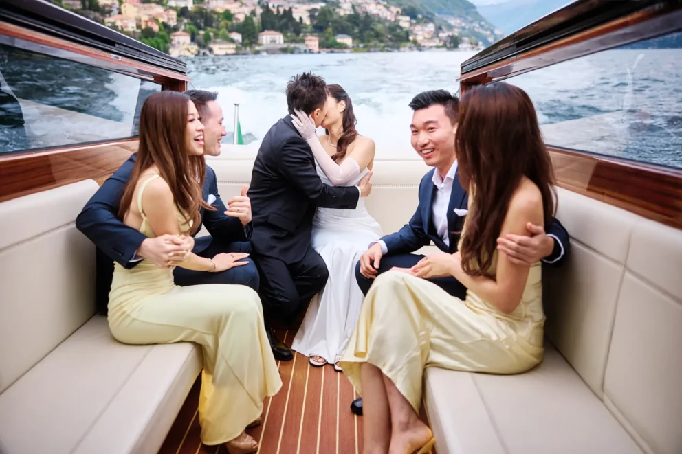 The celebration quickly moved from the villa to the water. We took them out on a classic Riva boat, not just for portraits, but for a true party on the water with their friends. Cruising along the shores of Lake Como, they shared toasts and laughter, creating a memory that was both stylish and genuinely fun.