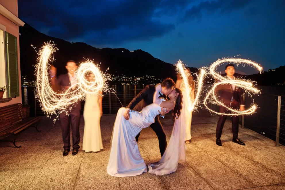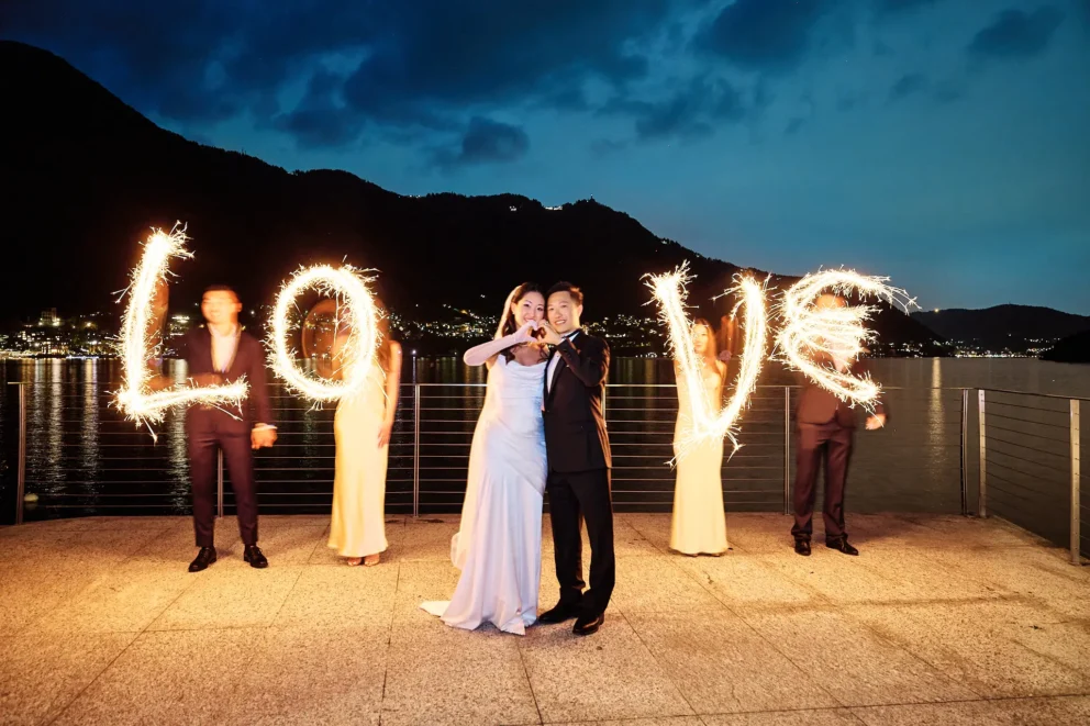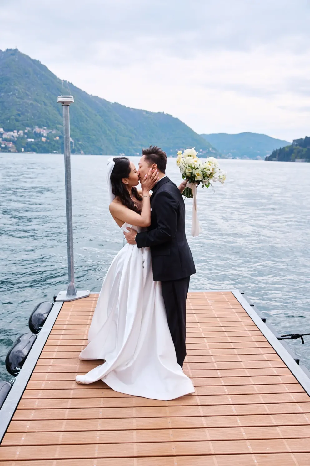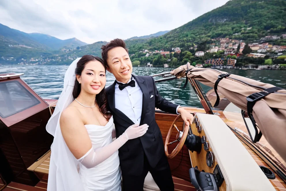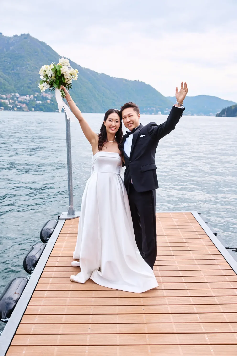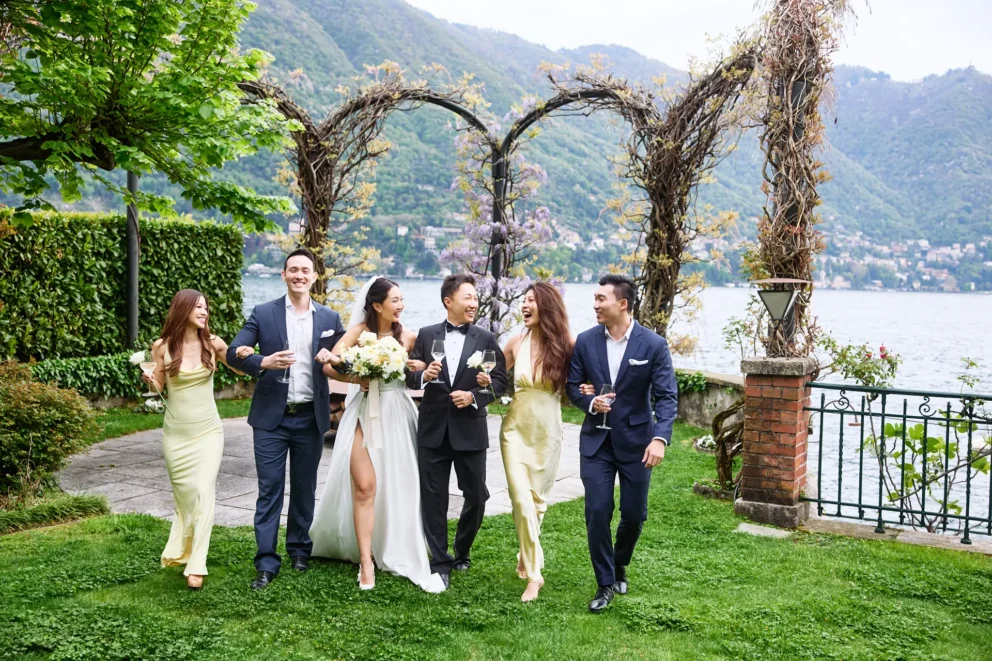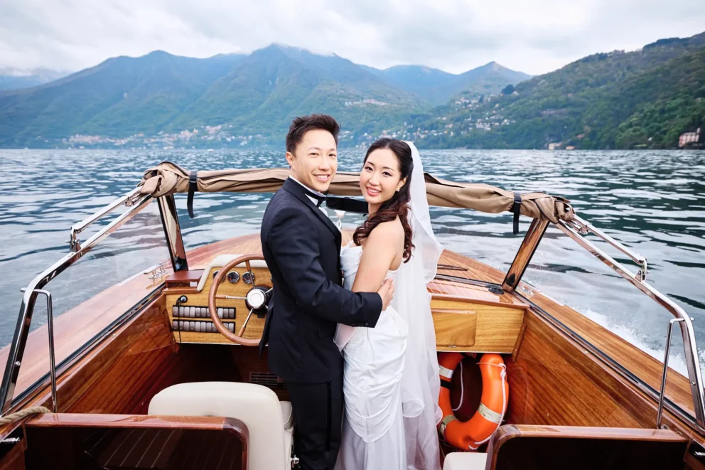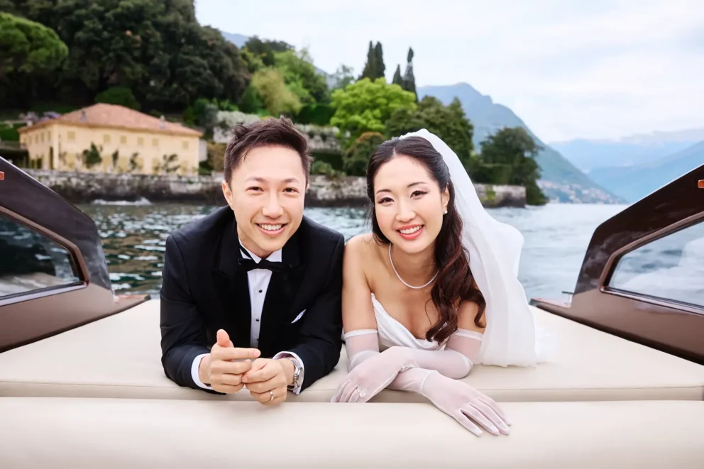 The celebration quickly moved from the villa to the water. We took them out on a classic Riva boat, not just for portraits, but for a true party on the water with their friends. Cruising along the shores of Lake Como, they shared toasts and laughter, creating a memory that was both stylish and genuinely fun.
