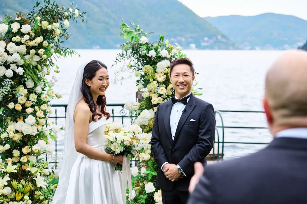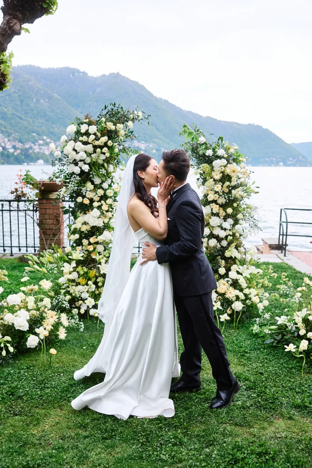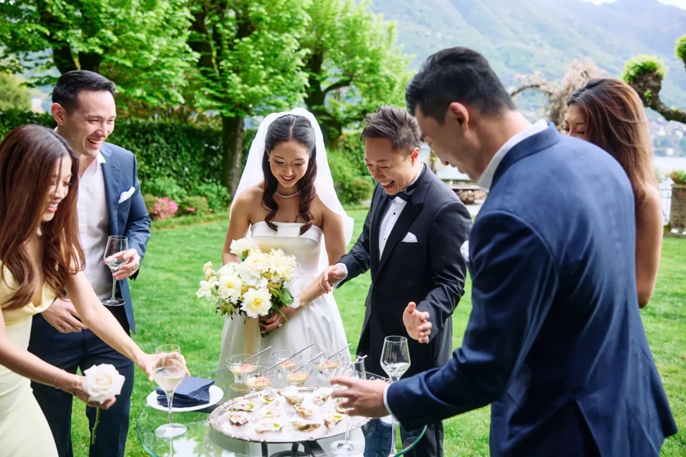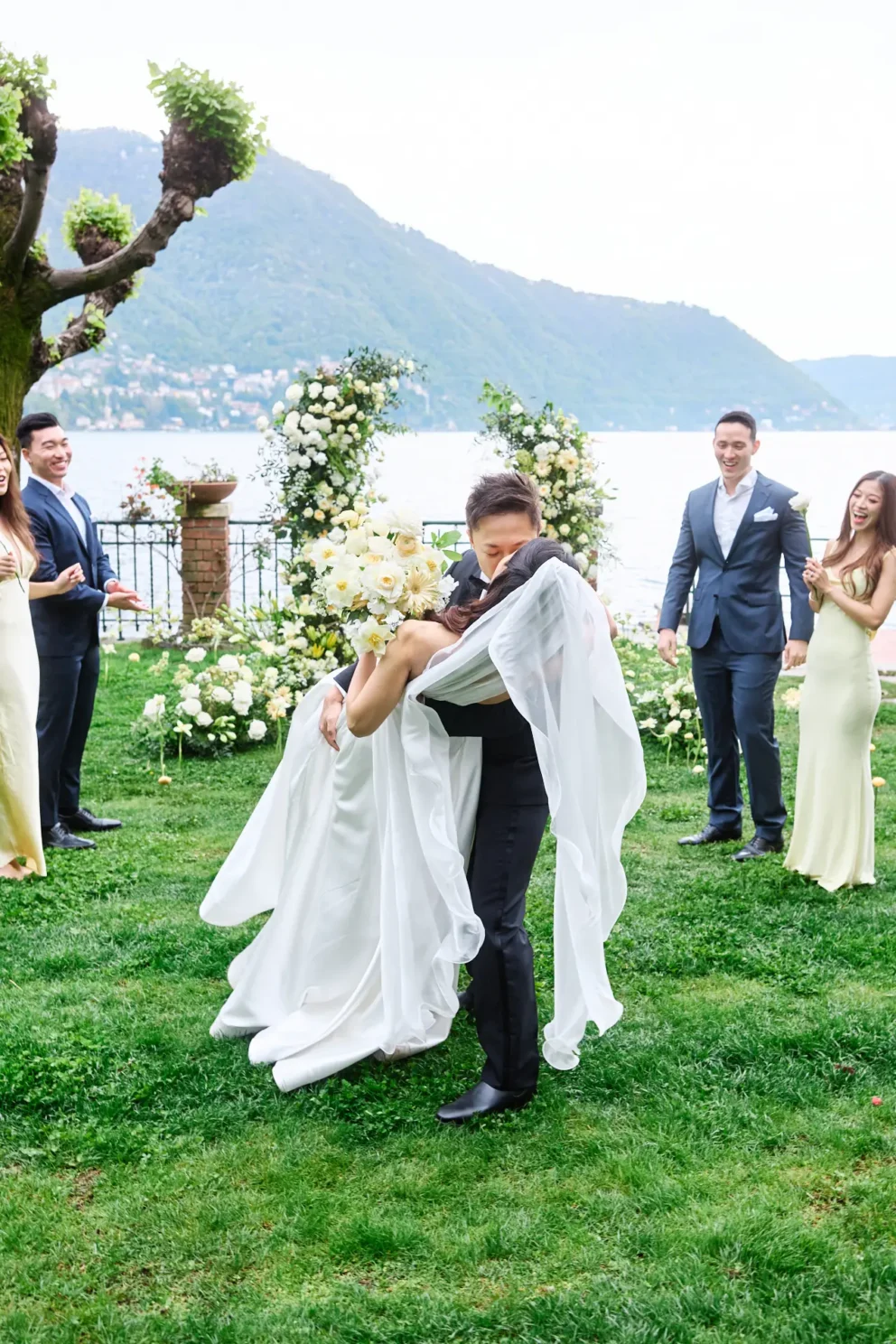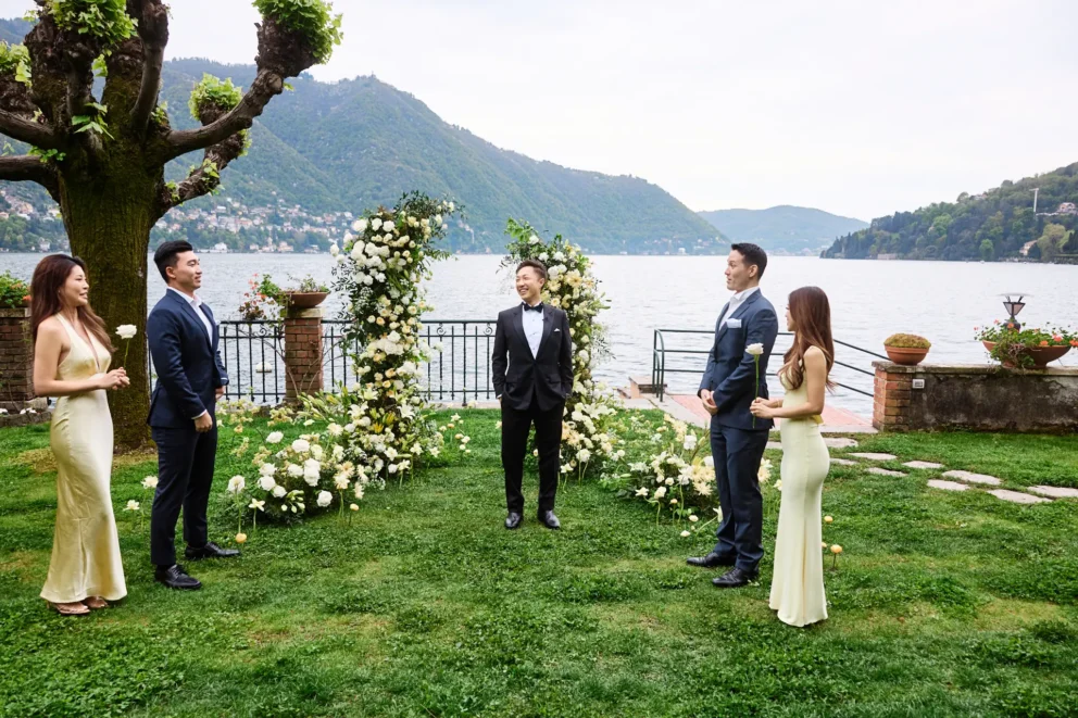 With the lake as their backdrop, they exchanged vows surrounded by their favorite people. The ceremony was followed immediately by an aperitivo, with drinks flowing and everyone celebrating on the lawn.