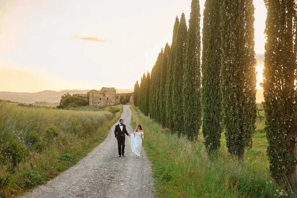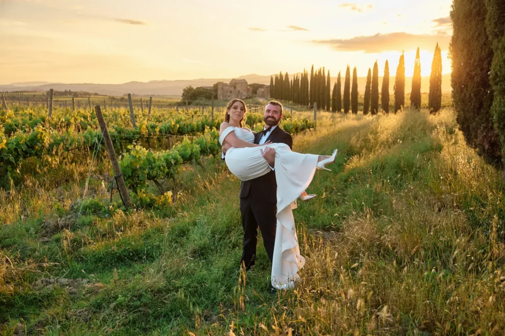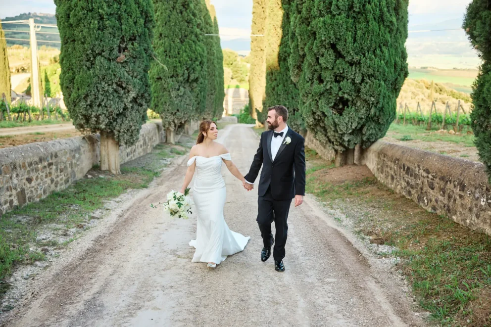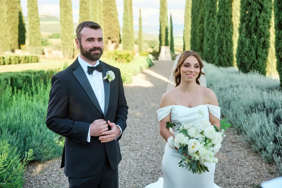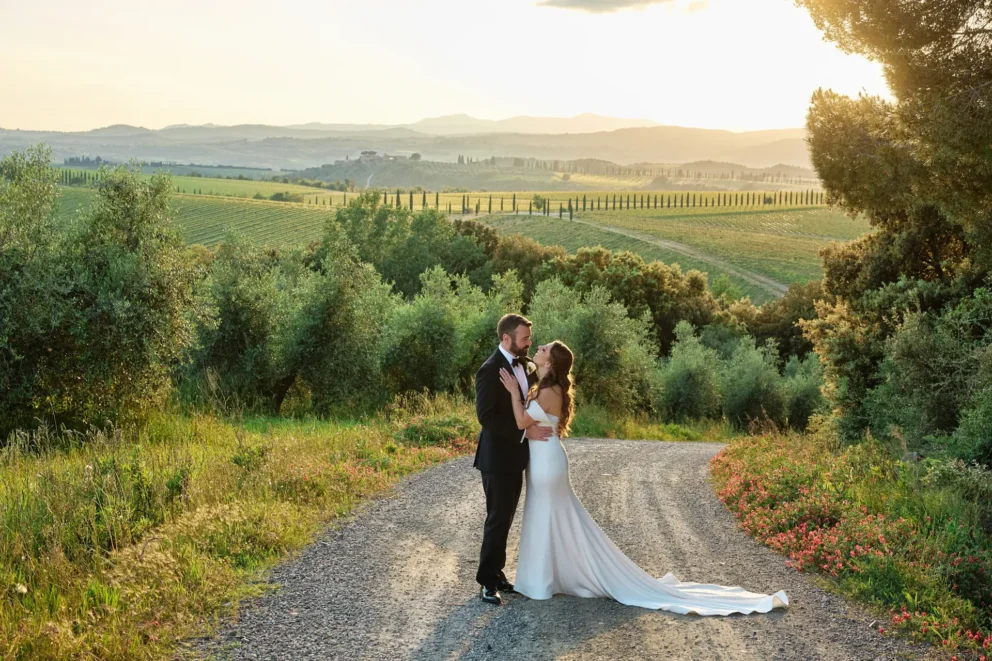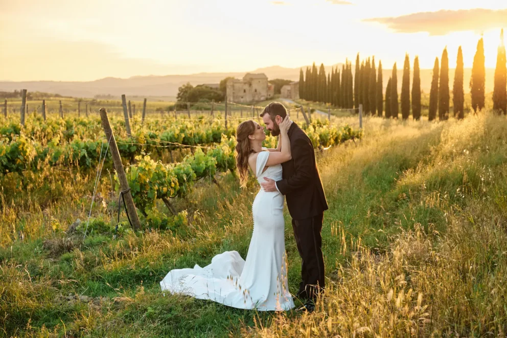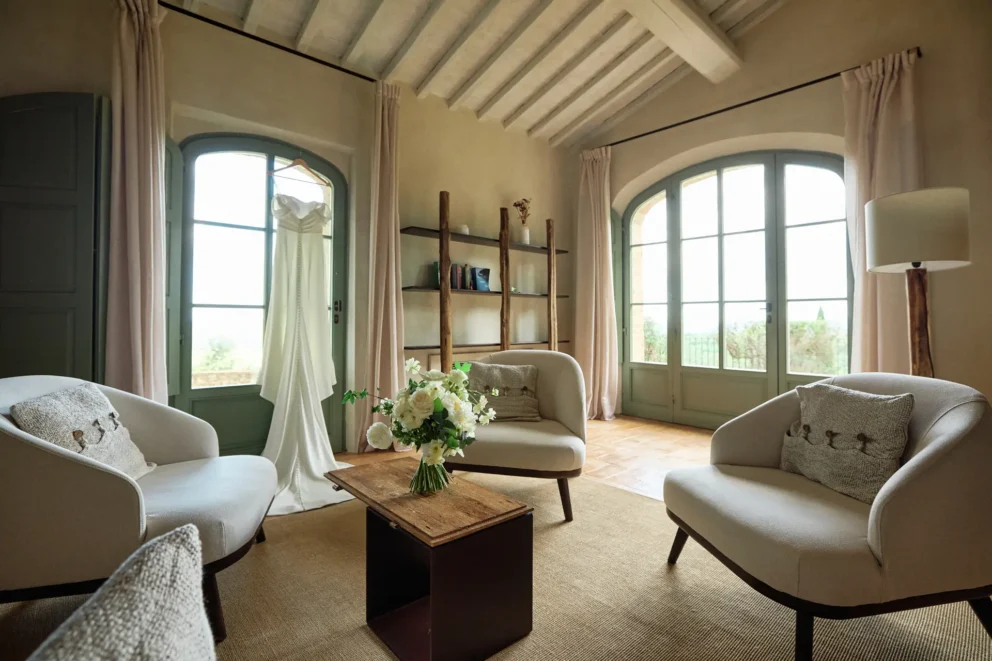 Argiano is a name that carries weight, synonymous with the history of Brunello di Montalcino. For Sarah and Brennan, the goal was beautifully simple: to make this legendary estate feel like their own private home for a day. Their vision for an intimate Tuscan winery elopement was about connection, not performance. They wanted to unwind, relax, and exchange vows surrounded by the lush green vineyards of early May, a quiet moment taken seriously and stylishly.