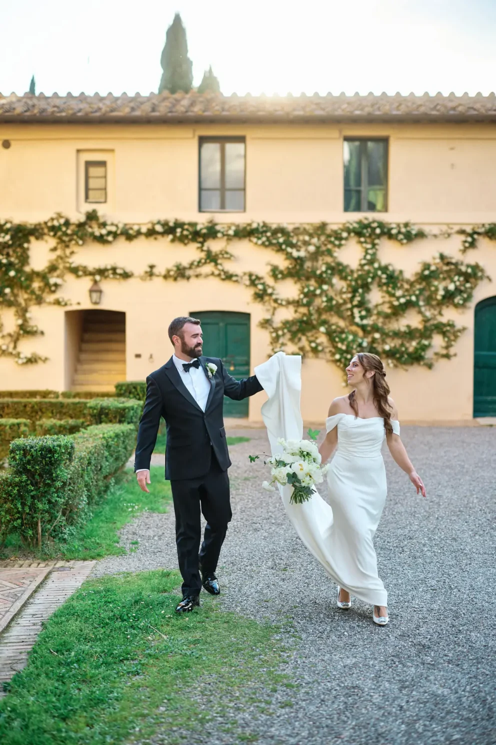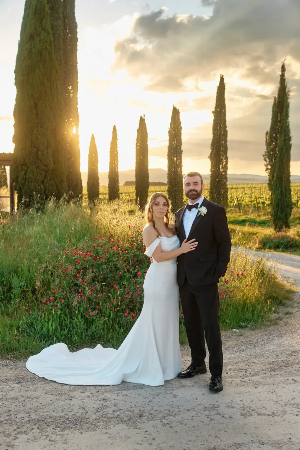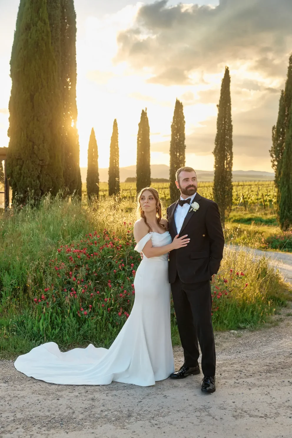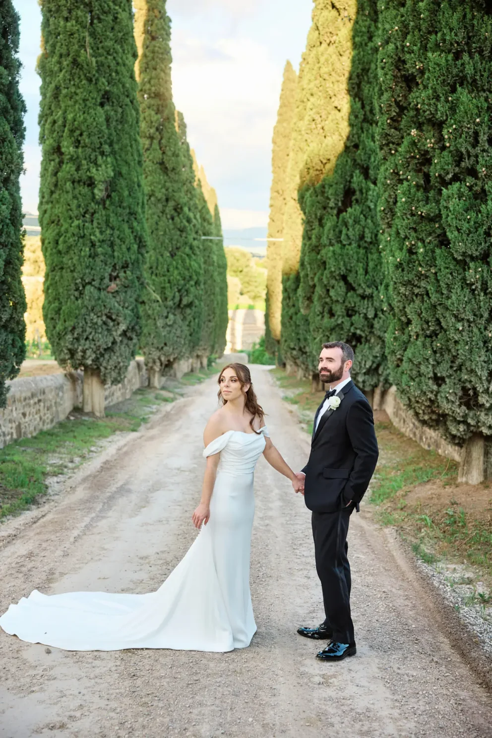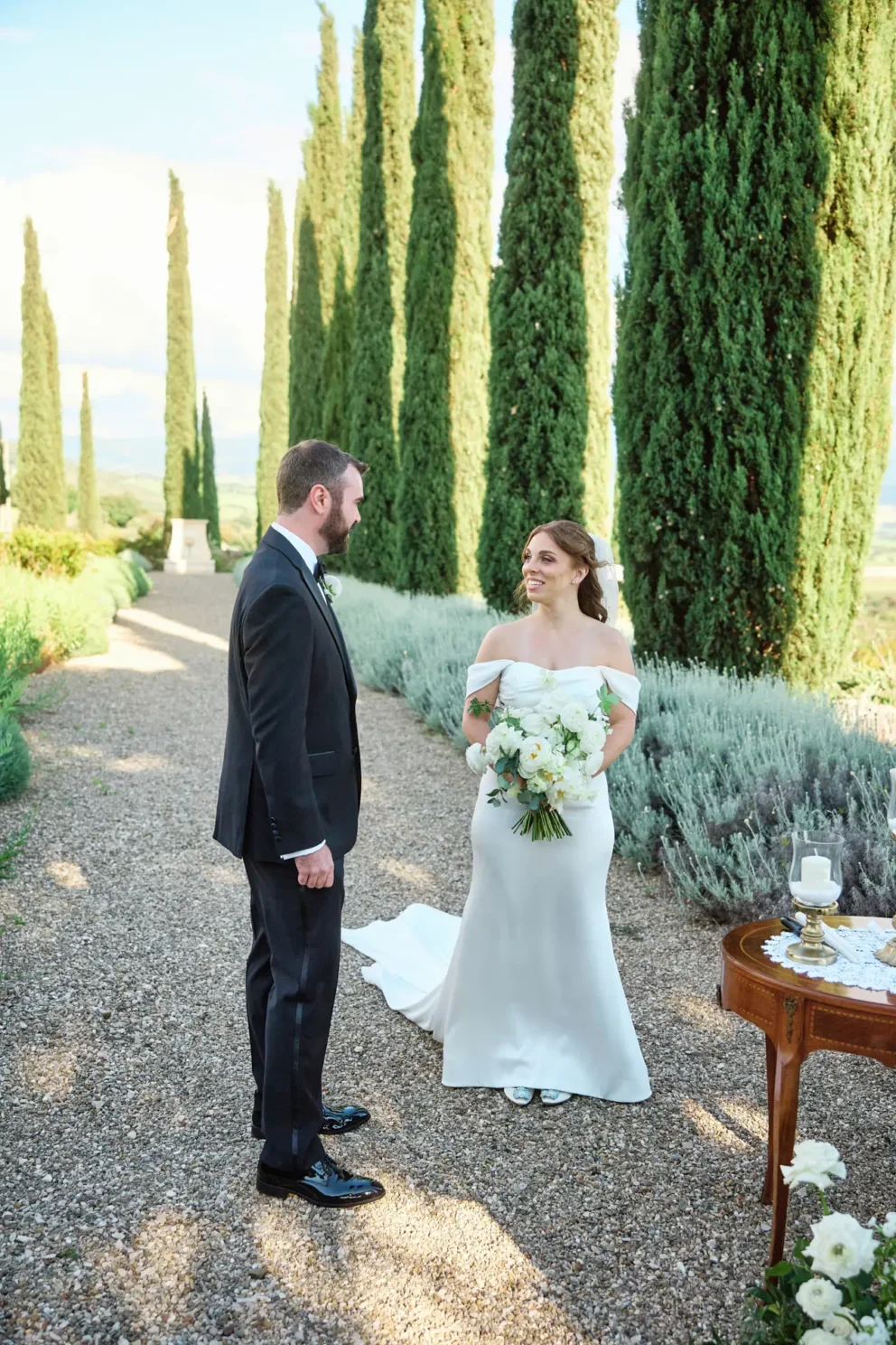 Argiano is a name that carries weight, synonymous with the history of Brunello di Montalcino. For Sarah and Brennan, the goal was beautifully simple: to make this legendary estate feel like their own private home for a day. Their vision for an intimate Tuscan winery elopement was about connection, not performance. They wanted to unwind, relax, and exchange vows surrounded by the lush green vineyards of early May, a quiet moment taken seriously and stylishly.