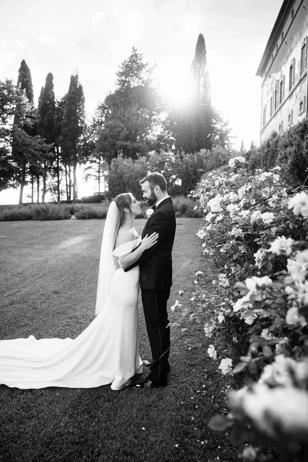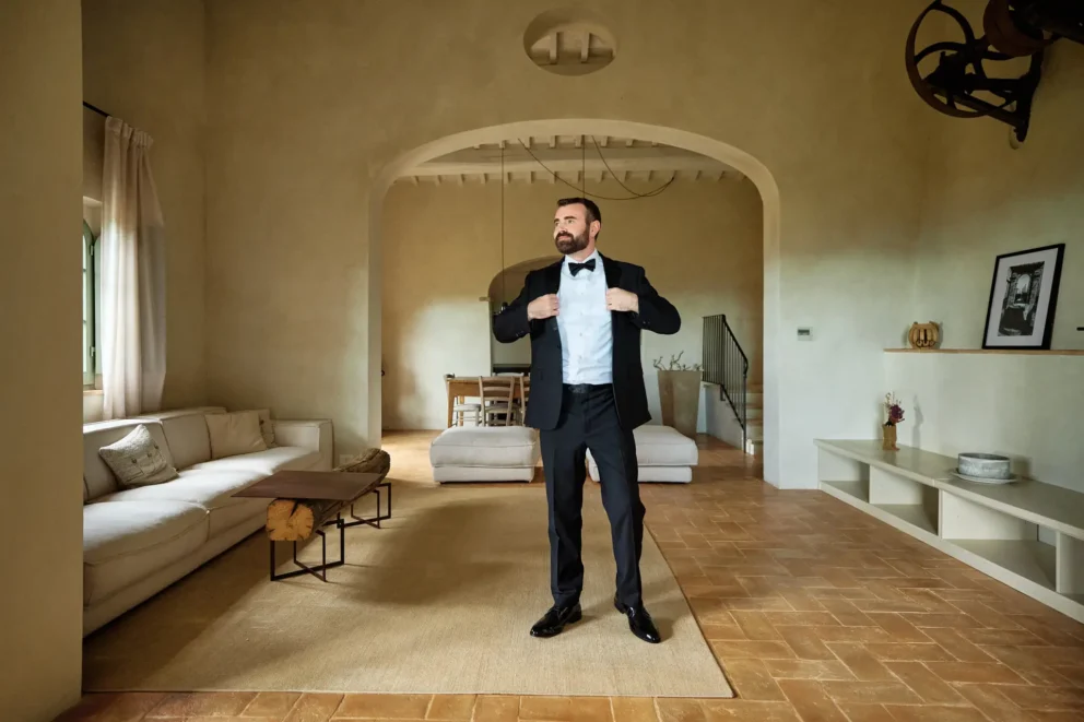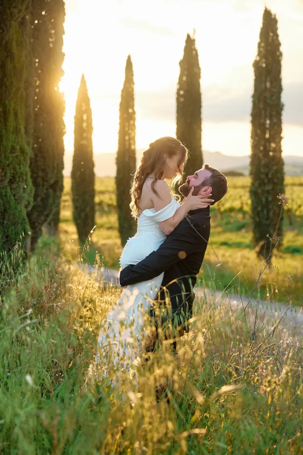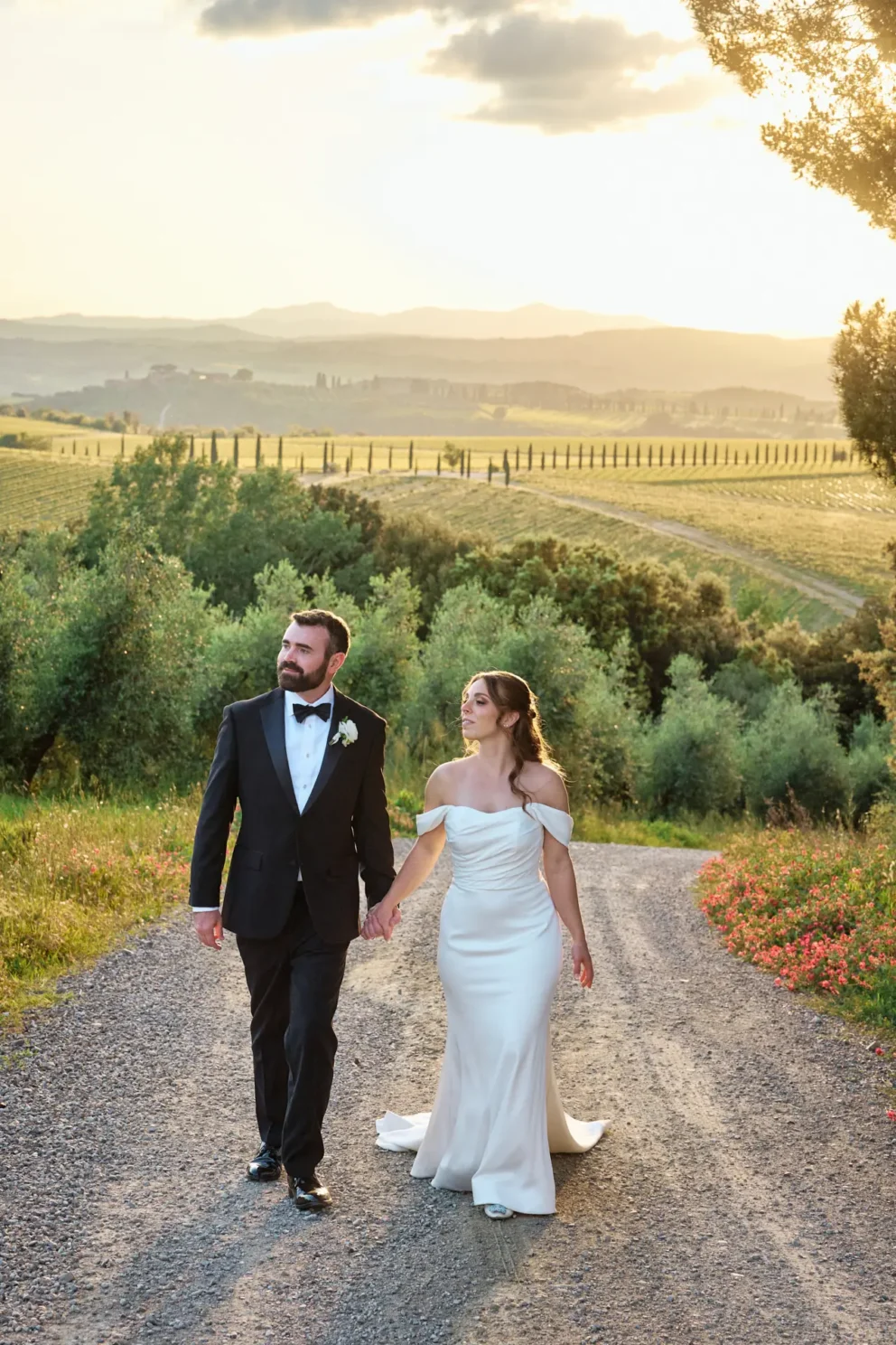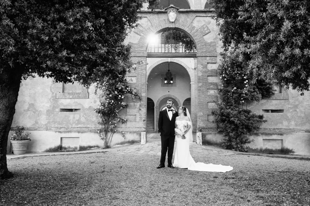 Argiano is a name that carries weight, synonymous with the history of Brunello di Montalcino. For Sarah and Brennan, the goal was beautifully simple: to make this legendary estate feel like their own private home for a day. Their vision for an intimate Tuscan winery elopement was about connection, not performance. They wanted to unwind, relax, and exchange vows surrounded by the lush green vineyards of early May, a quiet moment taken seriously and stylishly.