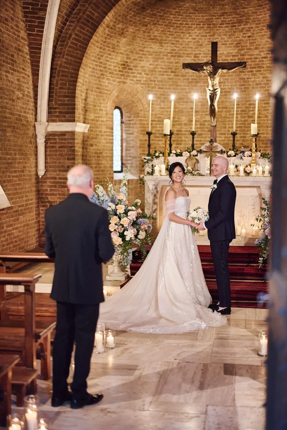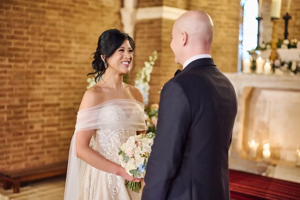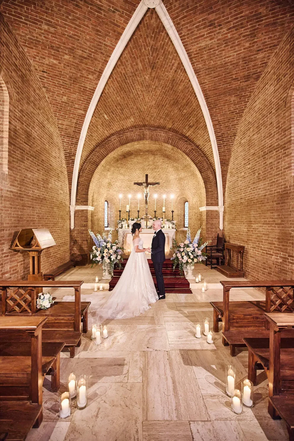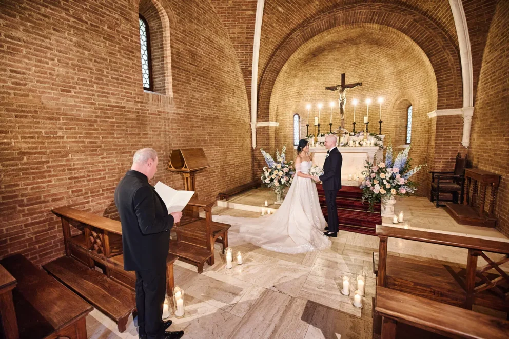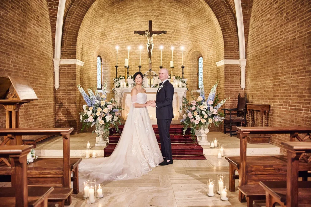 While many couples choose the gardens, Jacqueline and John were drawn to the feeling of the estate’s private chapel. Filled with candles and flowers, the space felt both grand and deeply intimate, a perfect reflection of their elegant, black-tie style.
