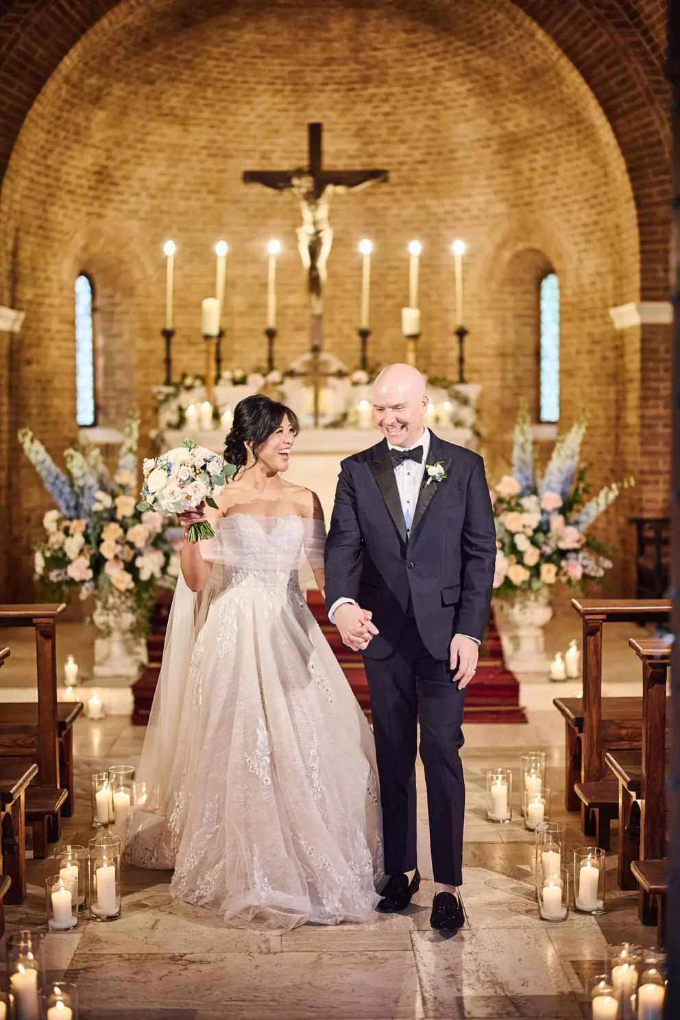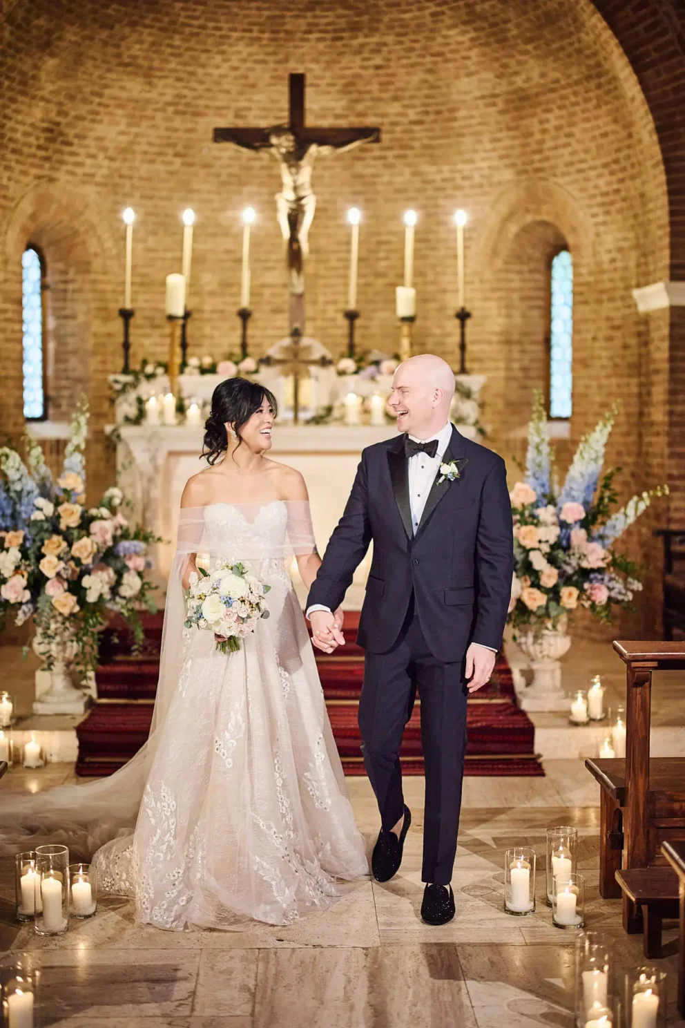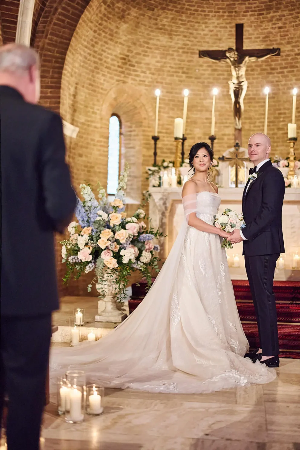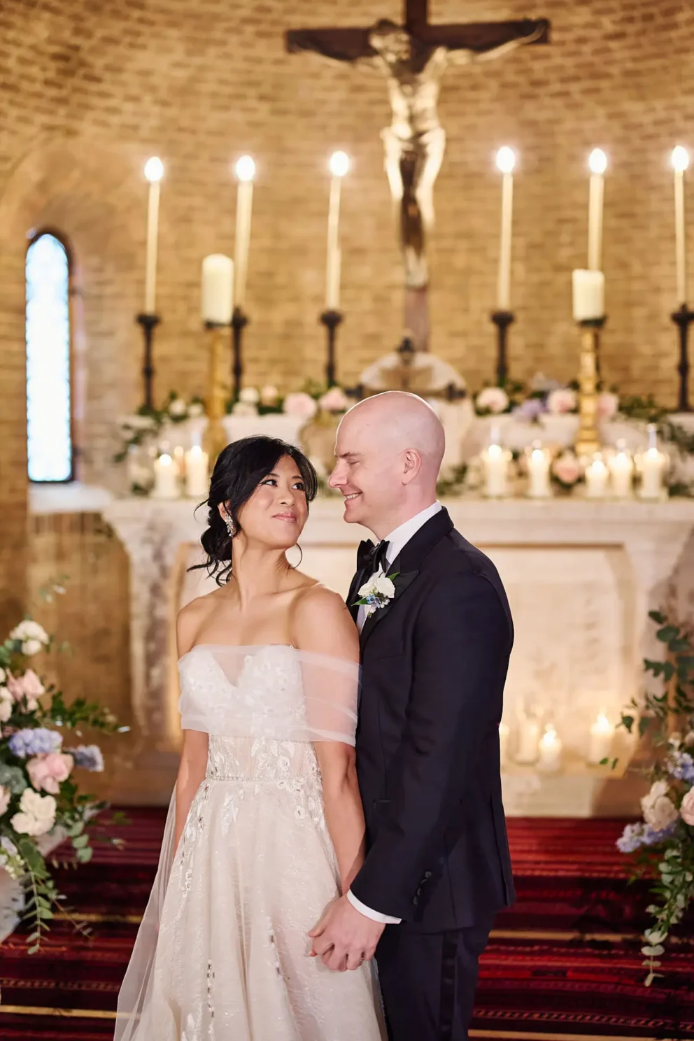 While many couples choose the gardens, Jacqueline and John were drawn to the feeling of the estate’s private chapel. Filled with candles and flowers, the space felt both grand and deeply intimate, a perfect reflection of their elegant, black-tie style.