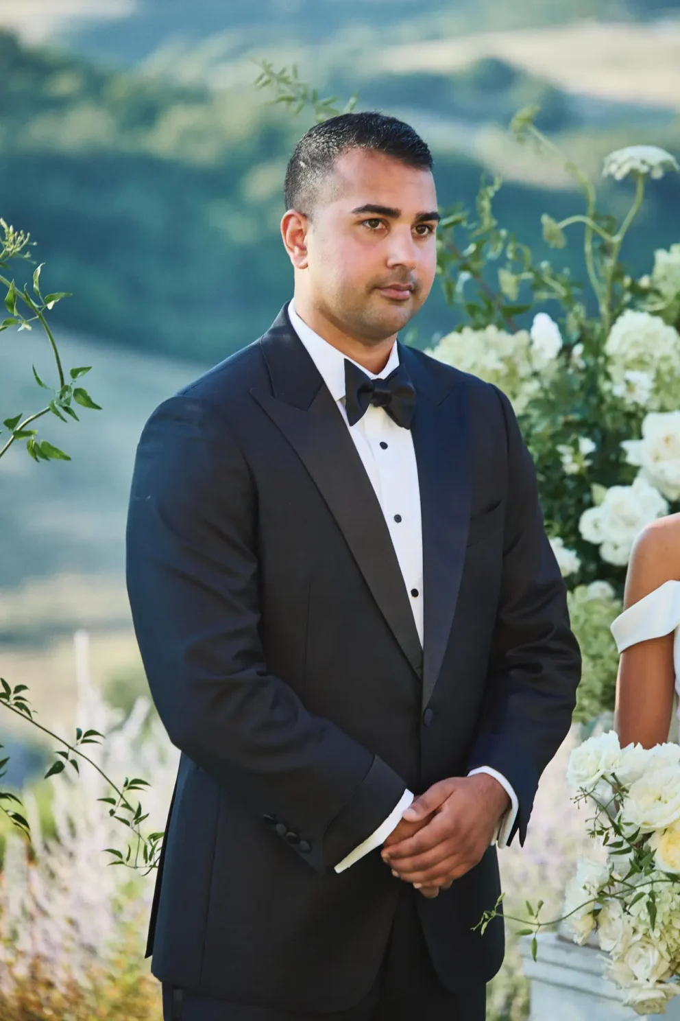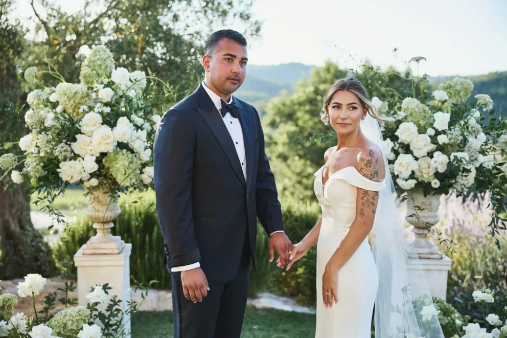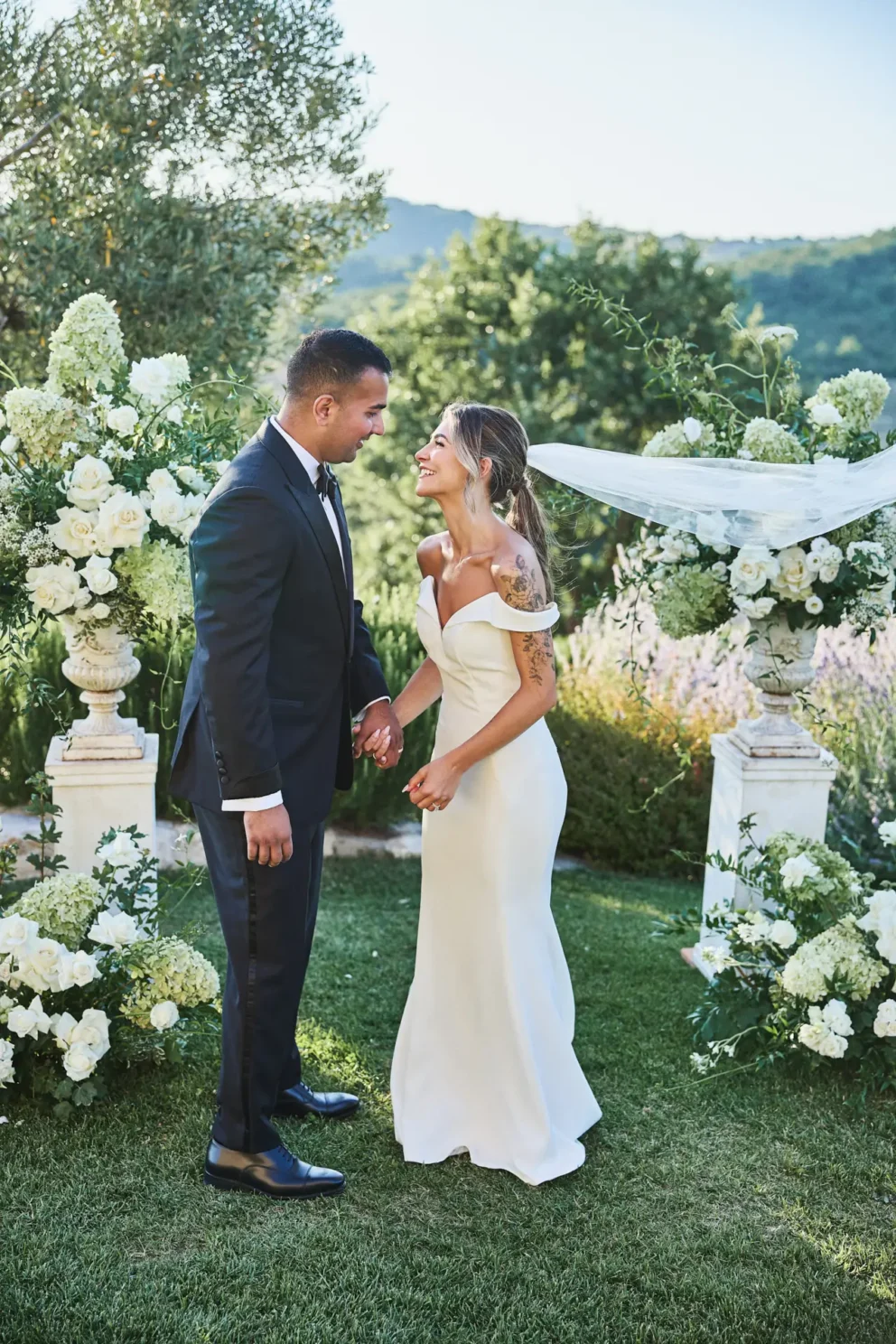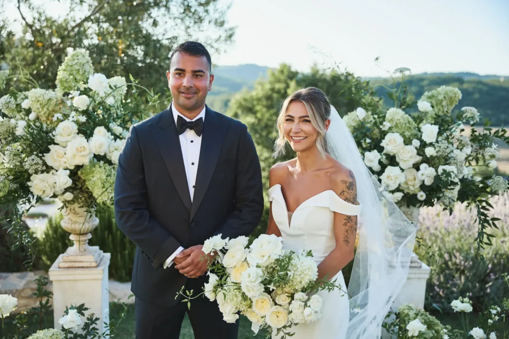 Their day began with the quiet intimacy of getting ready separately, building the anticipation for the moment they would finally meet for their ceremony. Outside, under the warm sun, they exchanged vows in front of two large compositions of white and green florals.