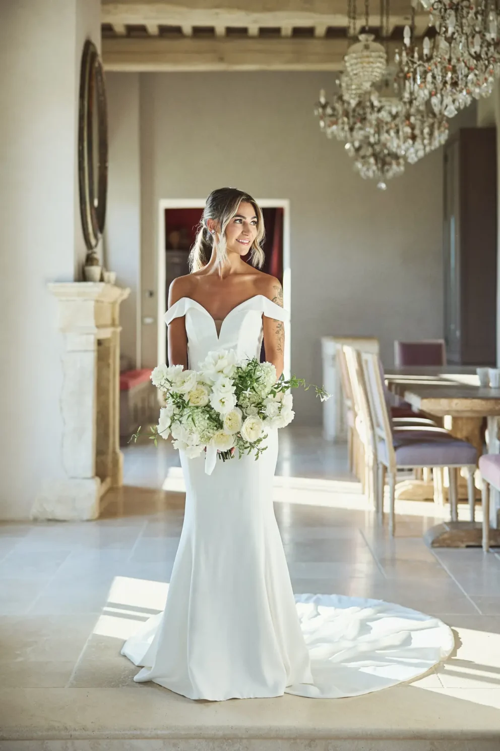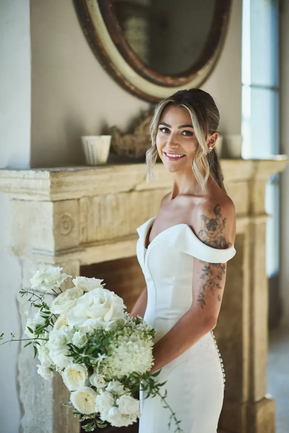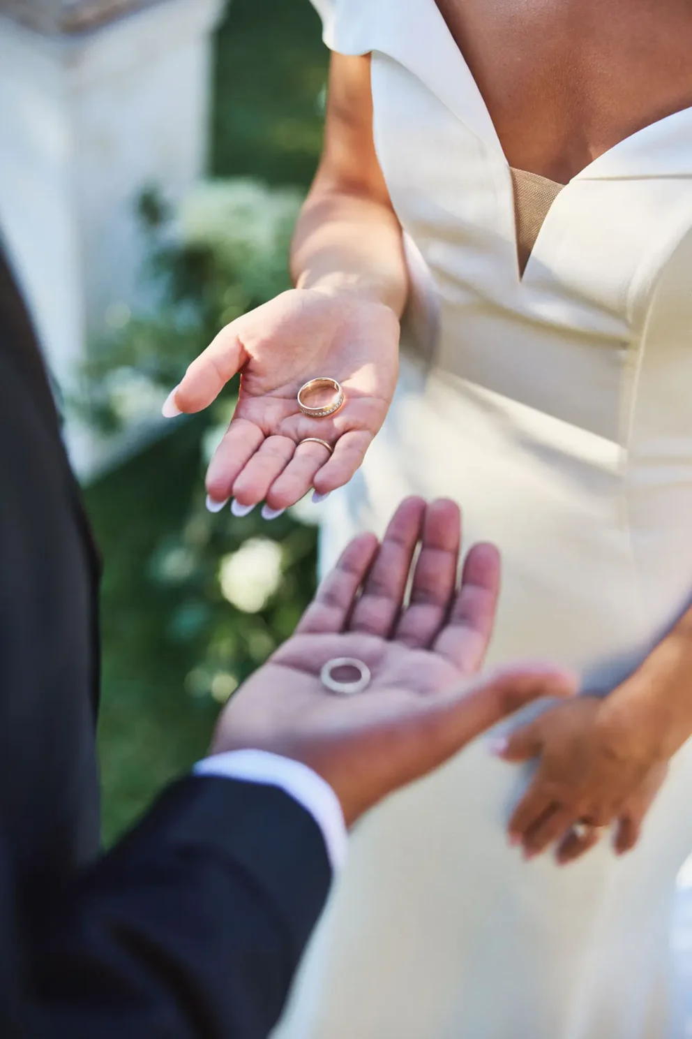Their day began with the quiet intimacy of getting ready separately, building the anticipation for the moment they would finally meet for their ceremony. Outside, under the warm sun, they exchanged vows in front of two large compositions of white and green florals.