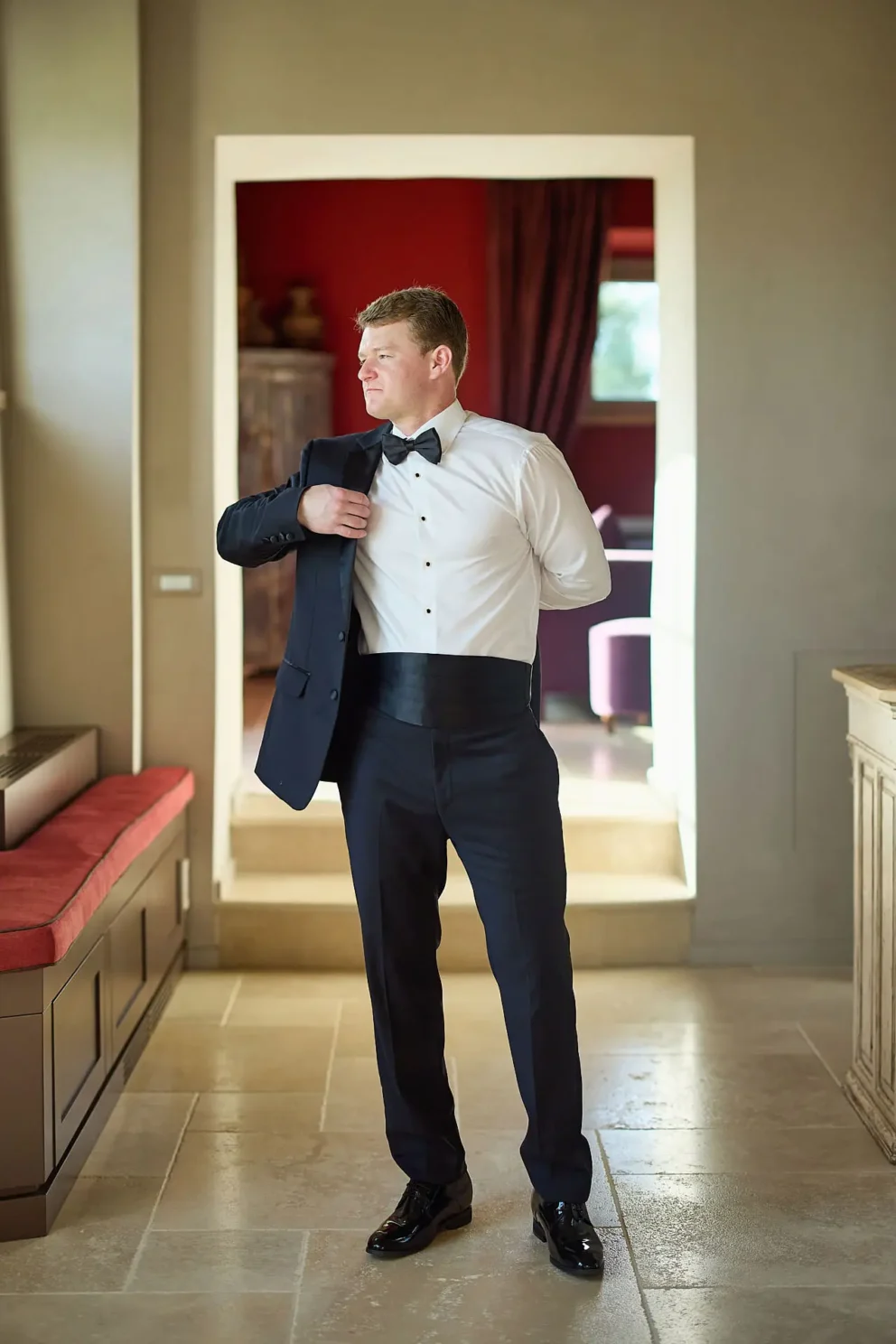 The day began with a satisfying stillness. As Joel adjusted his black tie, the only sound was the hum of cicadas in the fields below. Sabrina’s chic, clean look was a perfect counterpoint to the wild, rustic beauty of the landscape stretching out from her window.