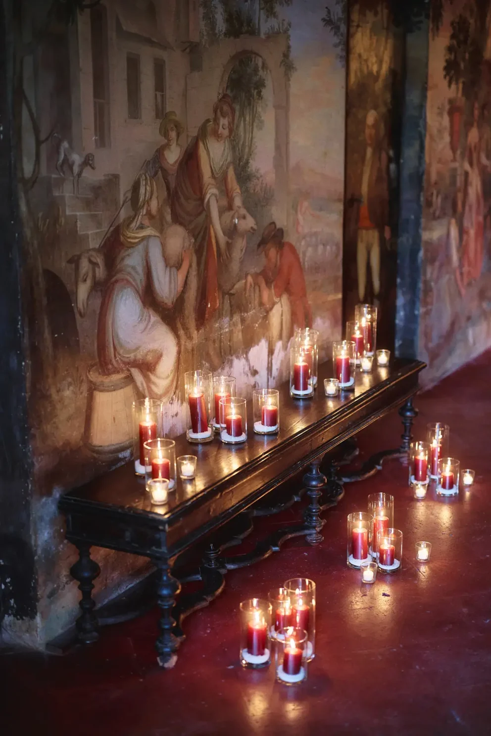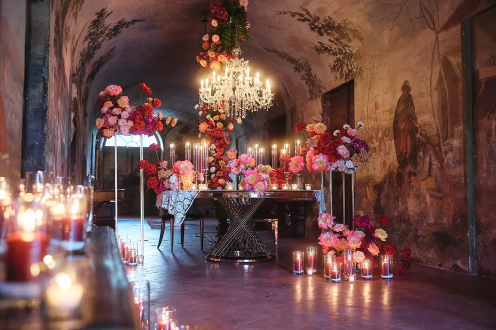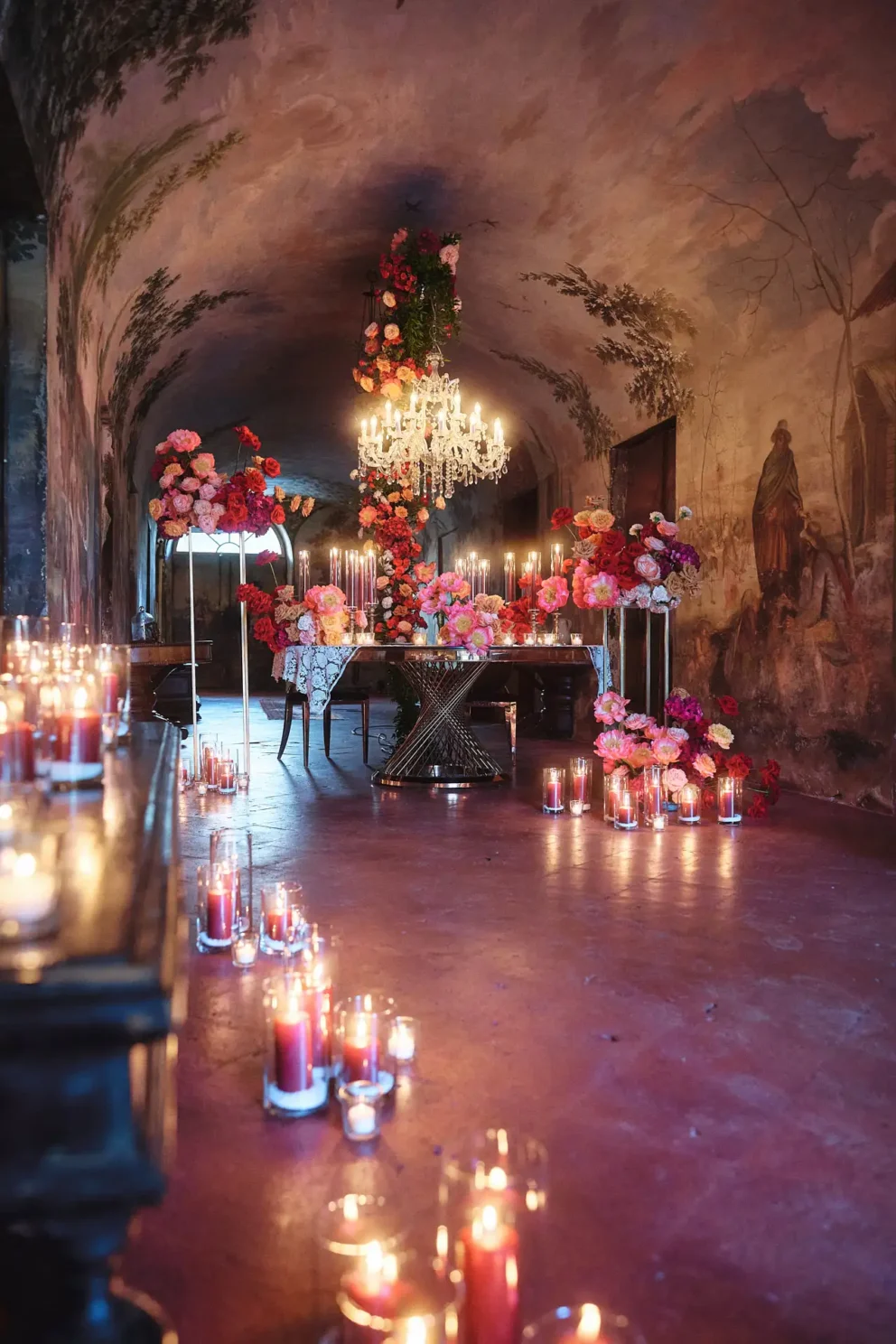 We placed a large, round table with a rose gold pedestal base and a black glass top directly in the center of the long, mural-covered corridor. On top, we set contemporary Versace plates, surrounded by cascading flowers and mixed-colored candles.