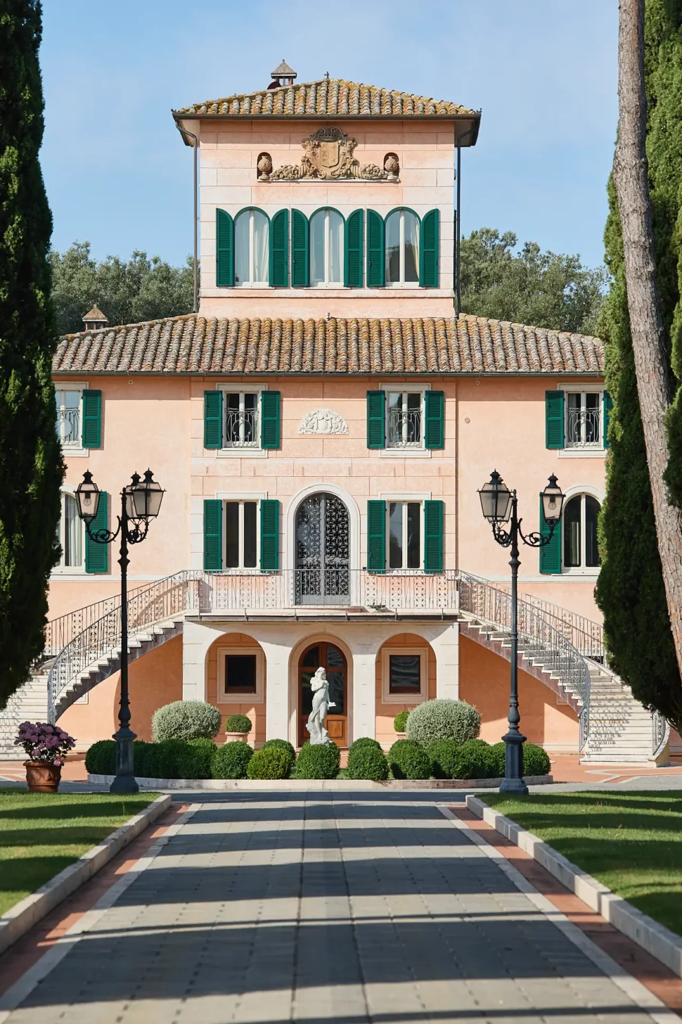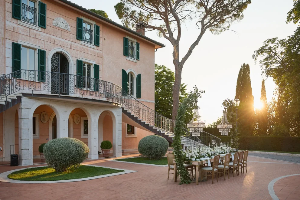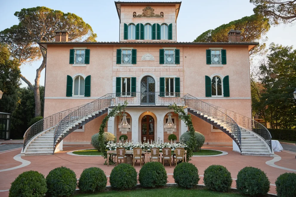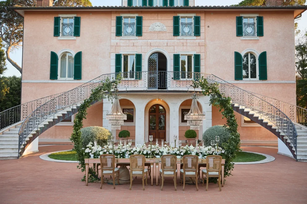 Above it, two dramatic crystal chandeliers hung against the darkening sky, reflecting in the tabletop and casting a warm glow on the villa’s facade. It was a statement of personal style, proving that a small guest count can be the perfect reason for a grand gesture.