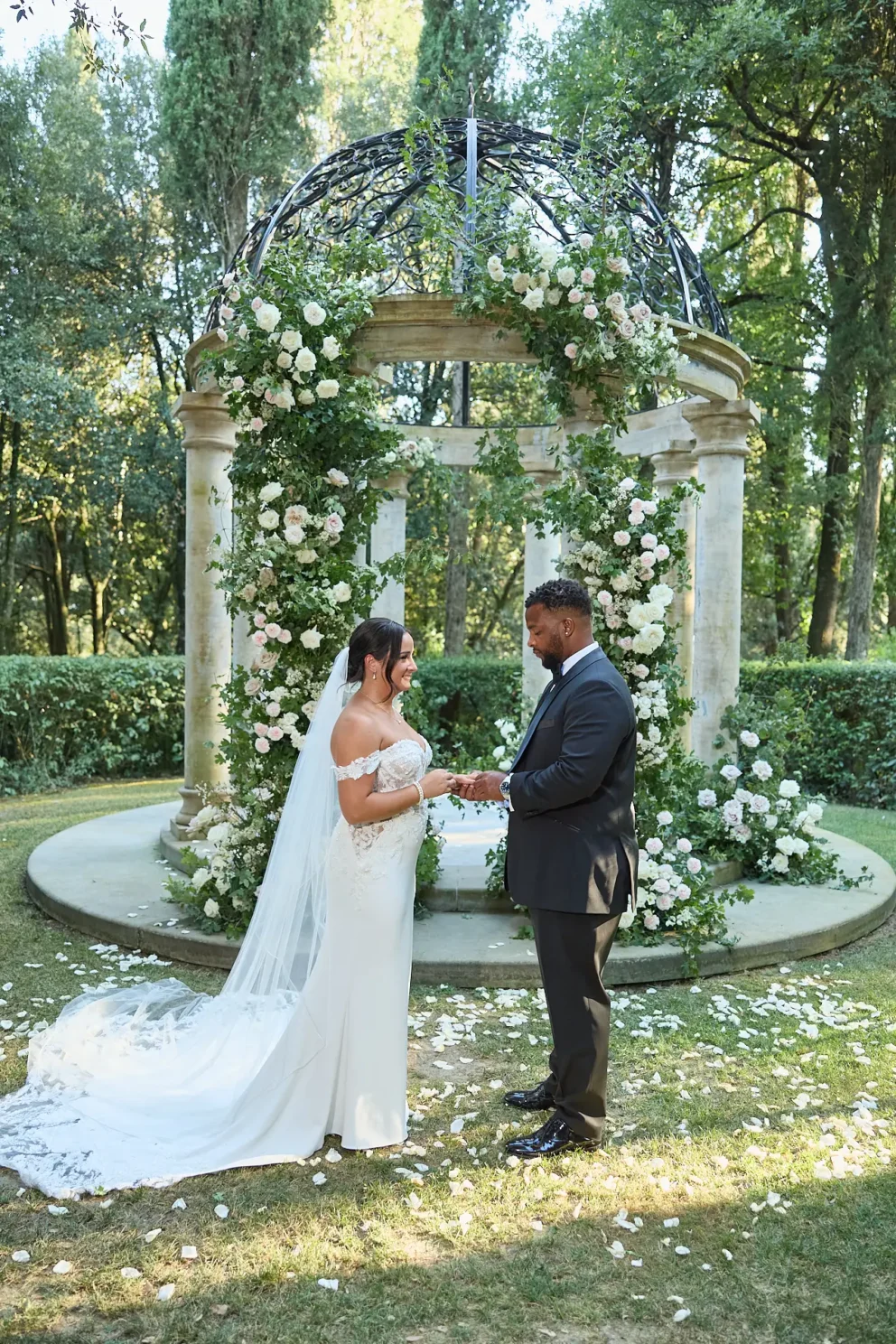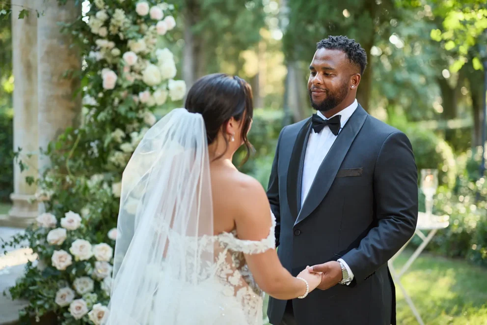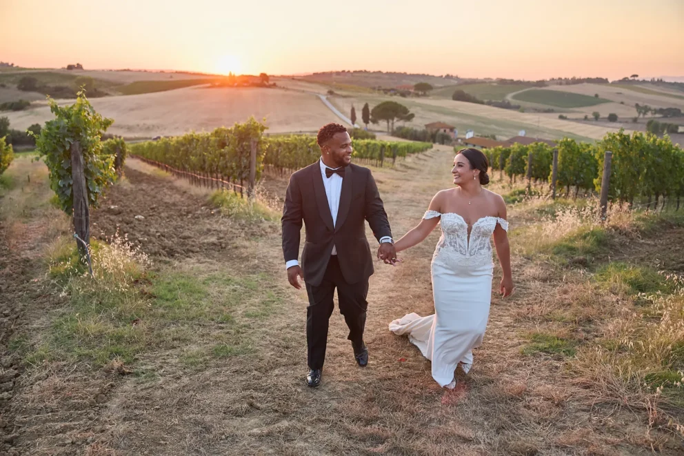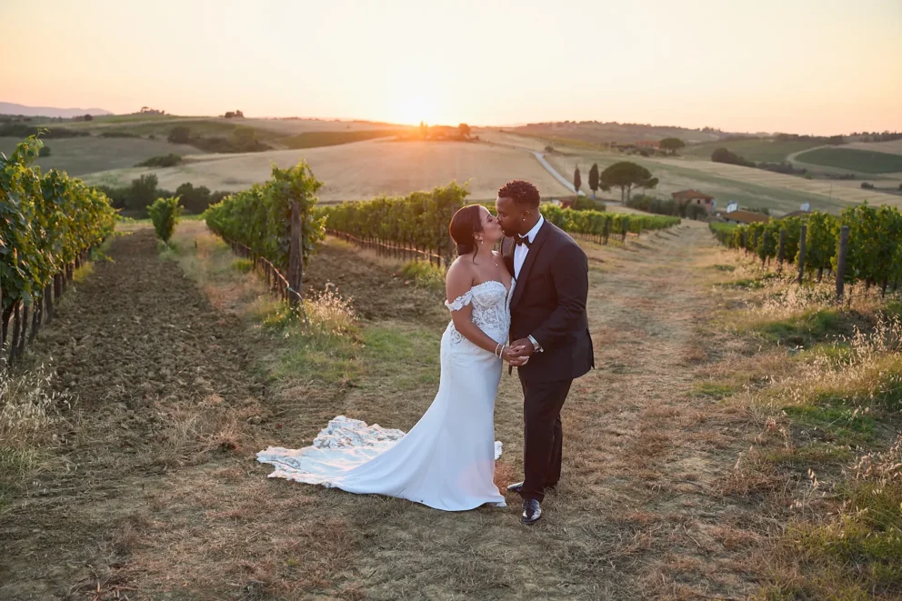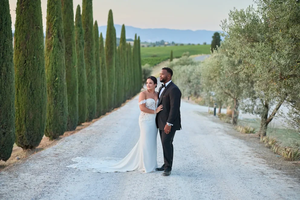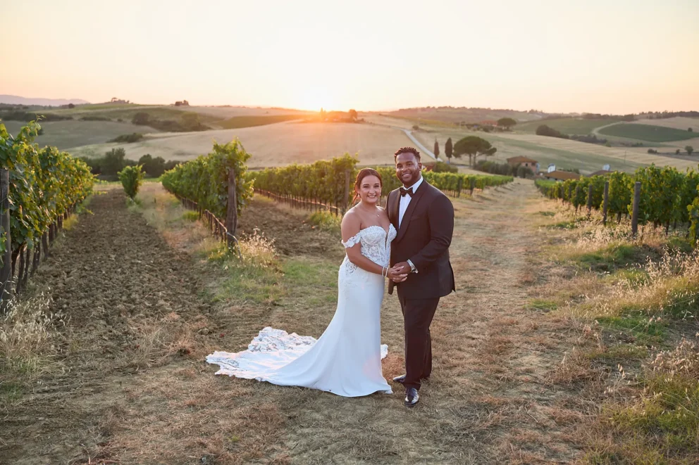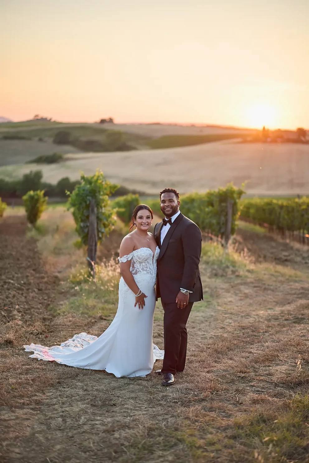Following the ceremony, guests were treated to a full aperitivo hour with canapés and drinks from the villa’s renowned caterer, Preludio. As golden hour settled over the vineyards, we captured family portraits before Alexa and Myles explored the grounds for their own quiet moments.