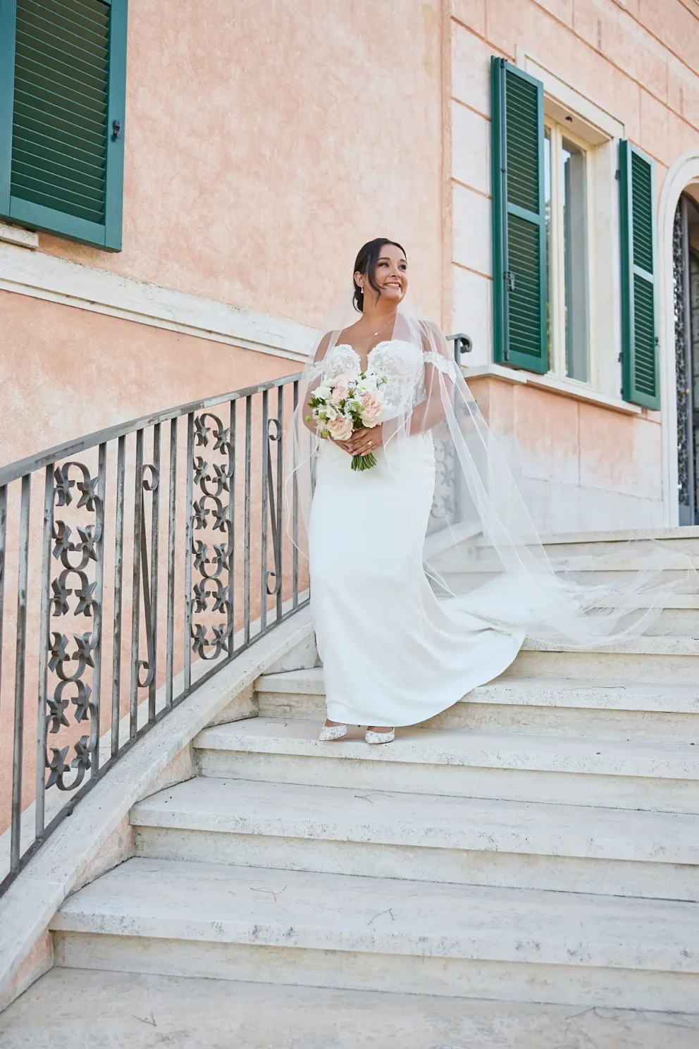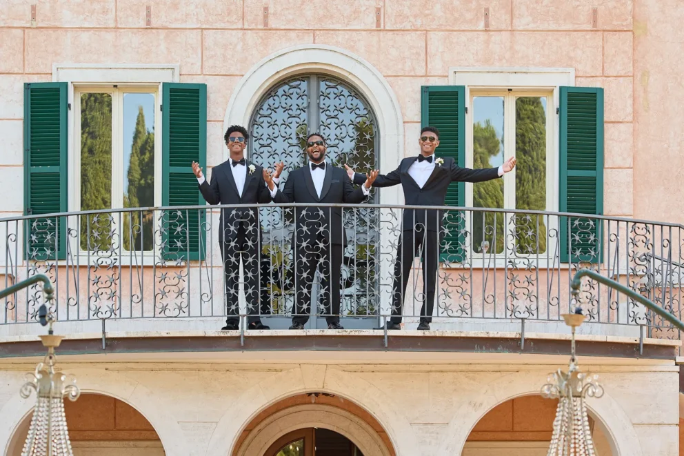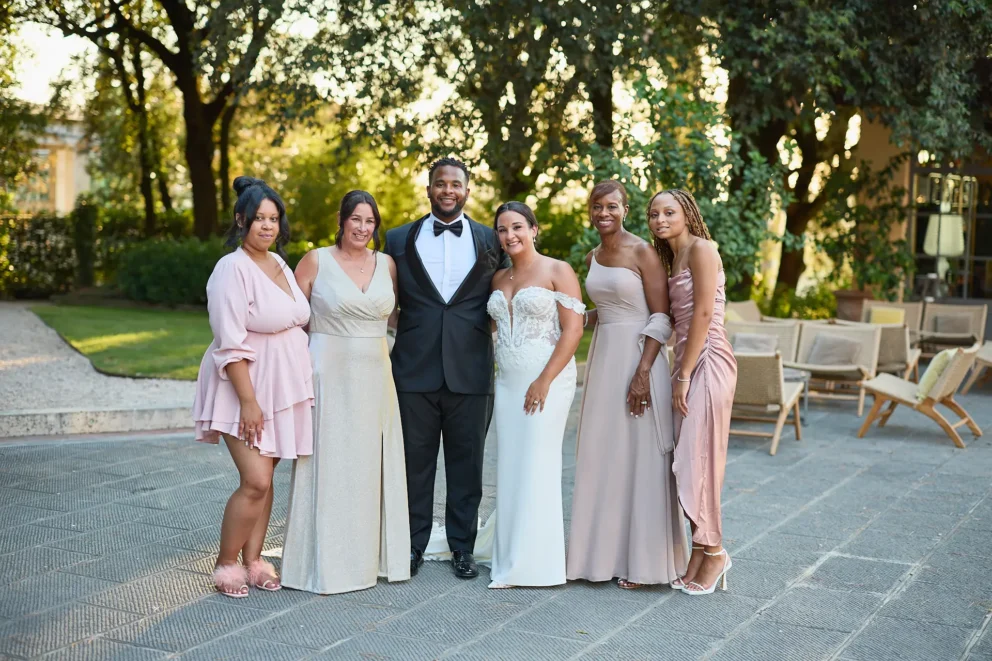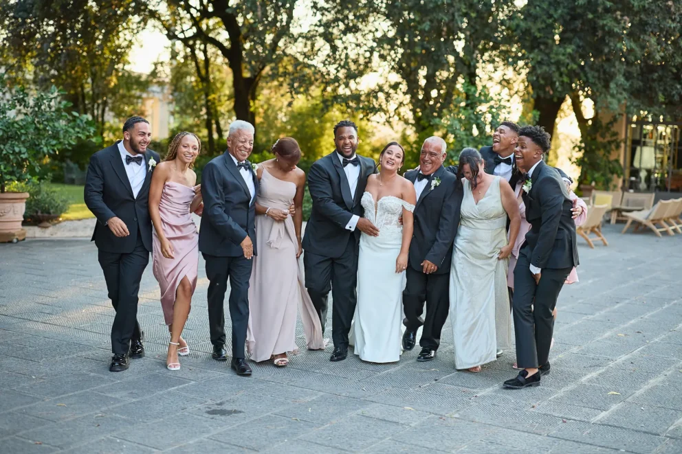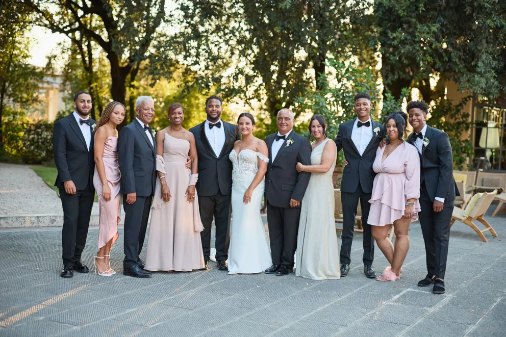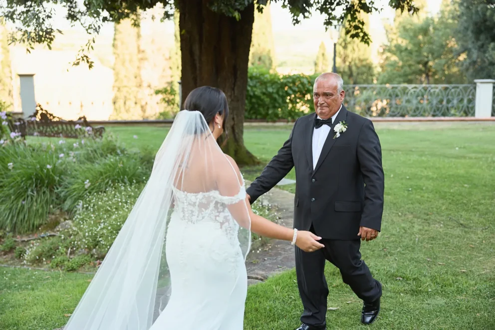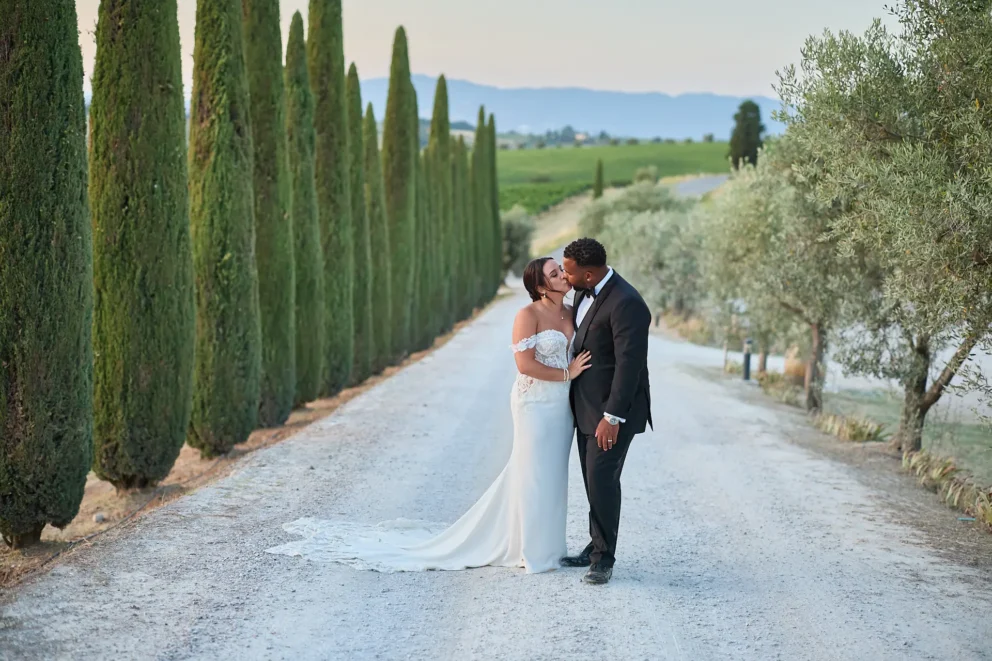 Following the ceremony, guests were treated to a full aperitivo hour with canapés and drinks from the villa’s renowned caterer, Preludio. As golden hour settled over the vineyards, we captured family portraits before Alexa and Myles explored the grounds for their own quiet moments.