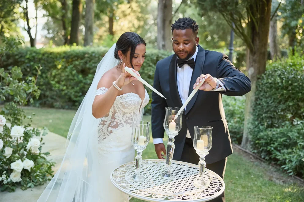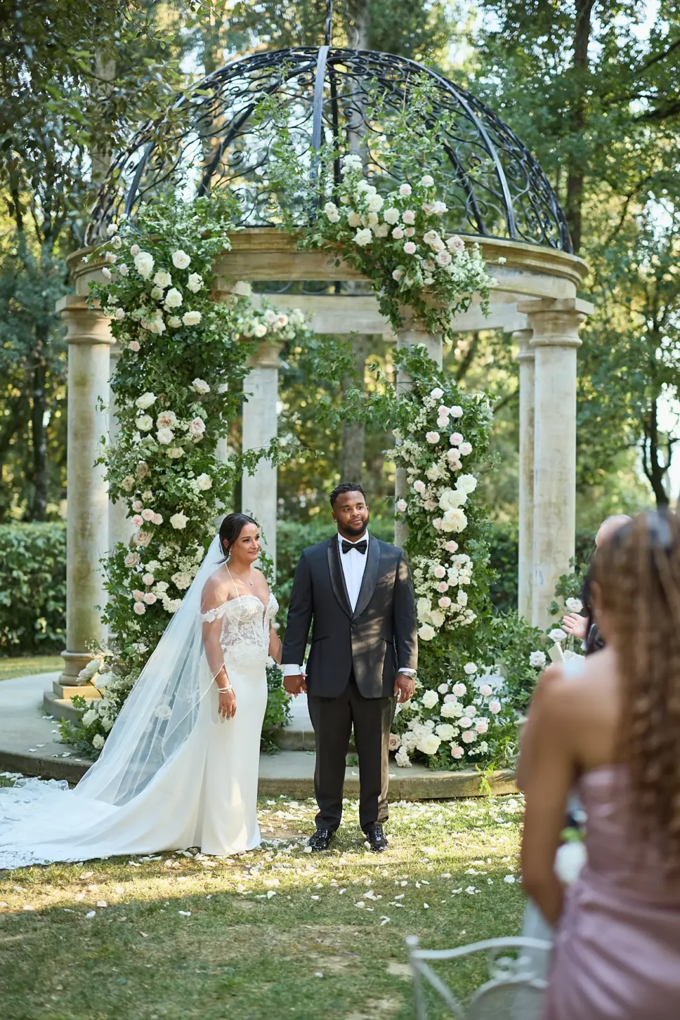 The historic structure was adorned with lush white florals, and a classical string trio filled the air with music. In front of their closest family, they exchanged deeply personal vows, concluding their ceremony with the lighting of a unity candle, a simple, powerful symbol of their two families becoming one.