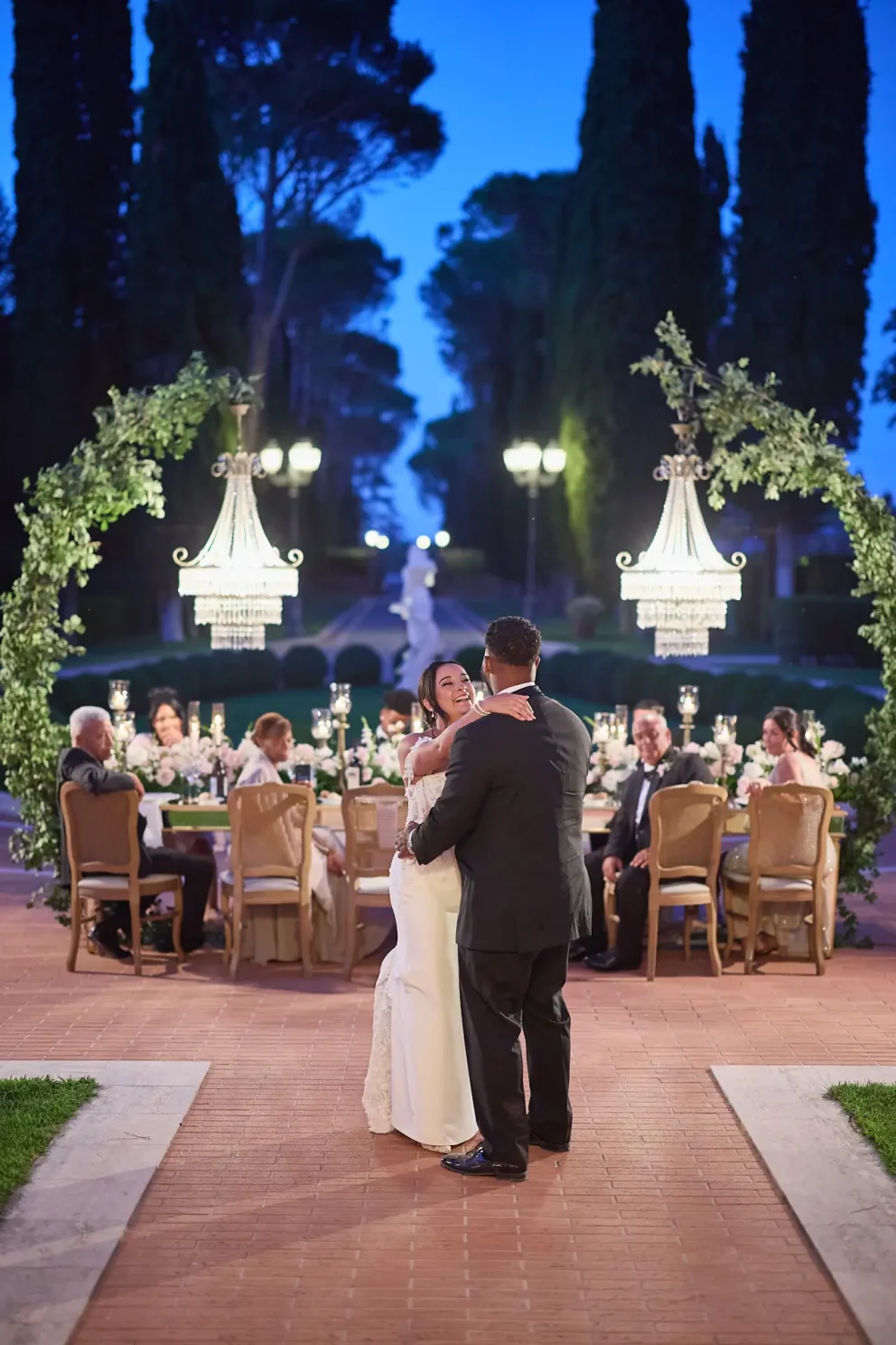 The celebration continued with a first dance and heartfelt speeches under the stars. Then came a moment of pure Italian theatre: the “cake show.” The chef came out to prepare their wedding cake, a traditional millefoglie, right before their eyes.