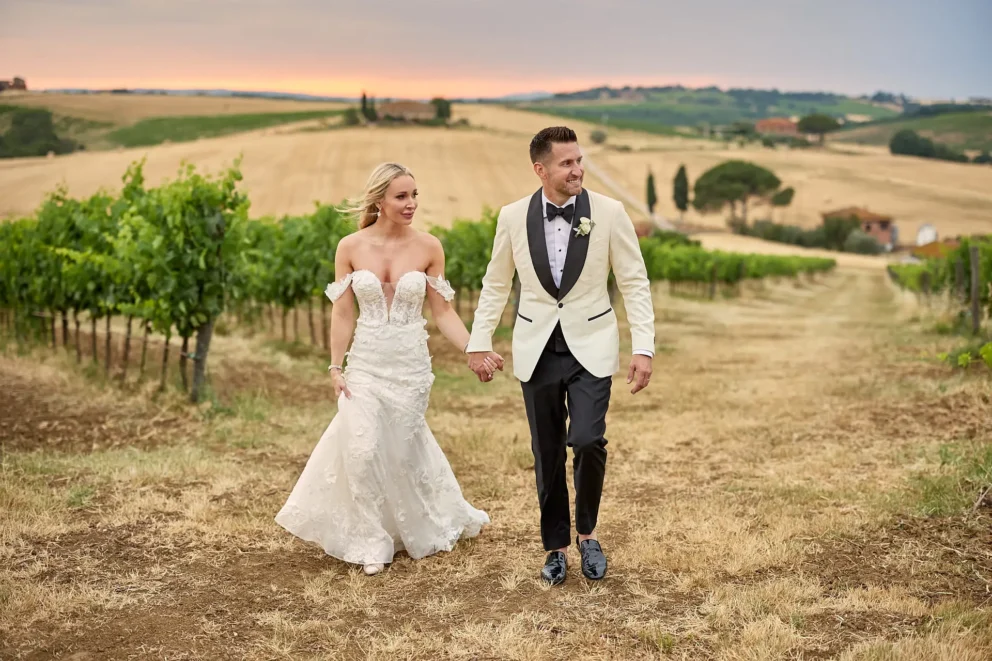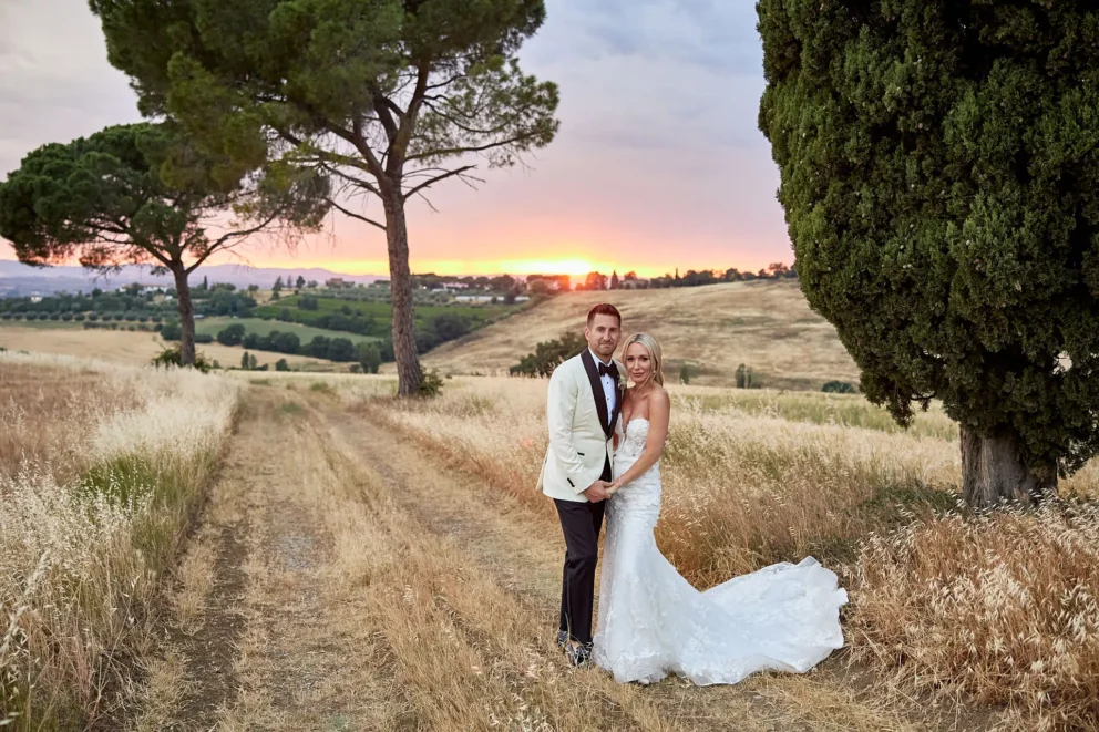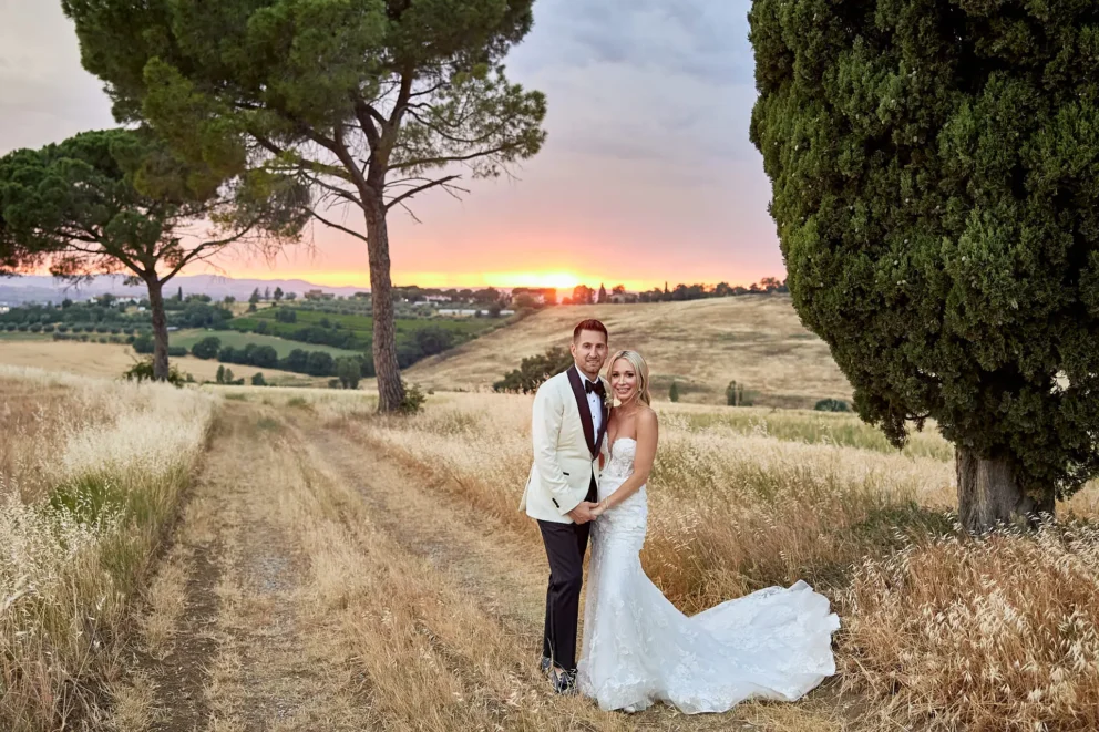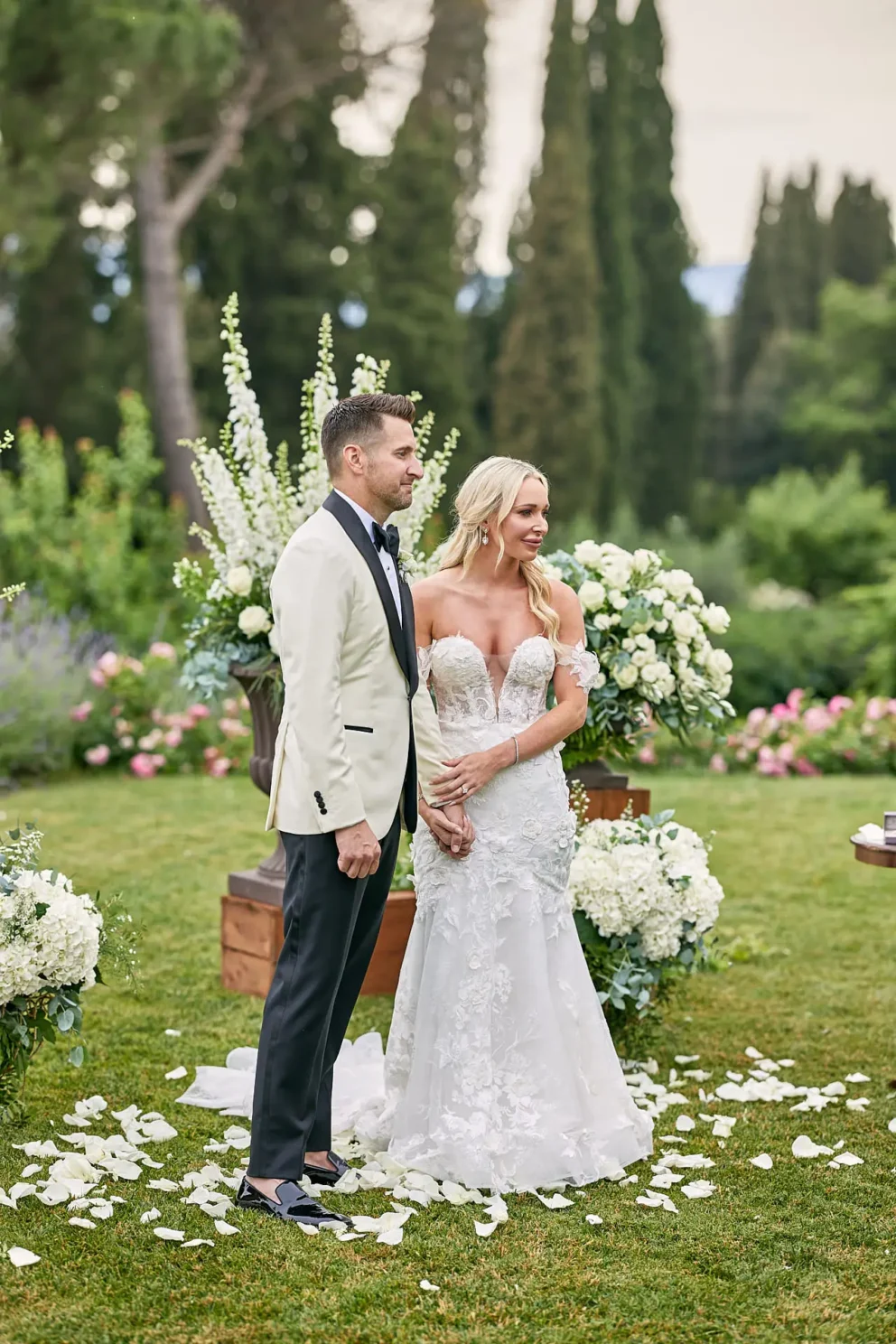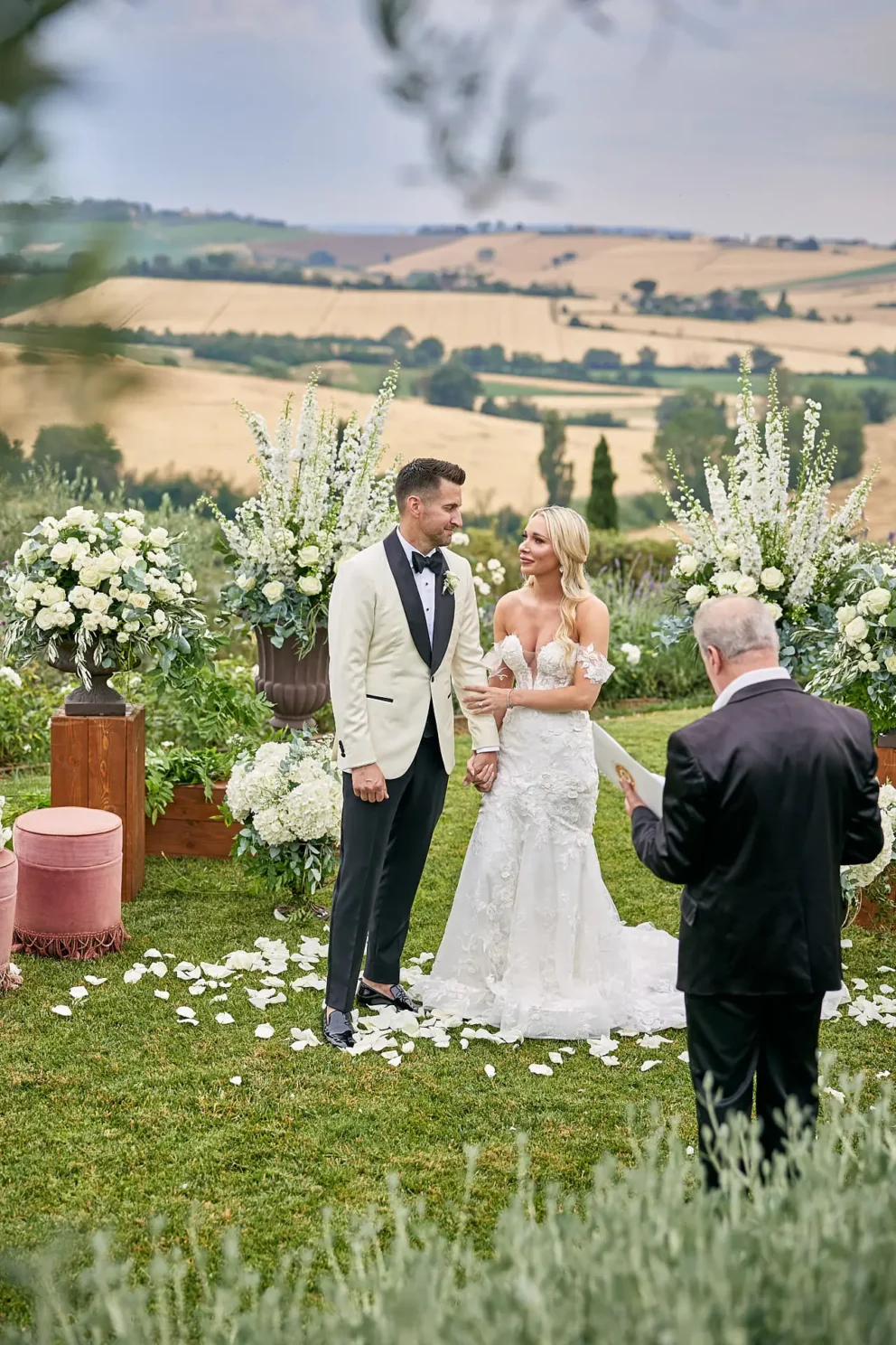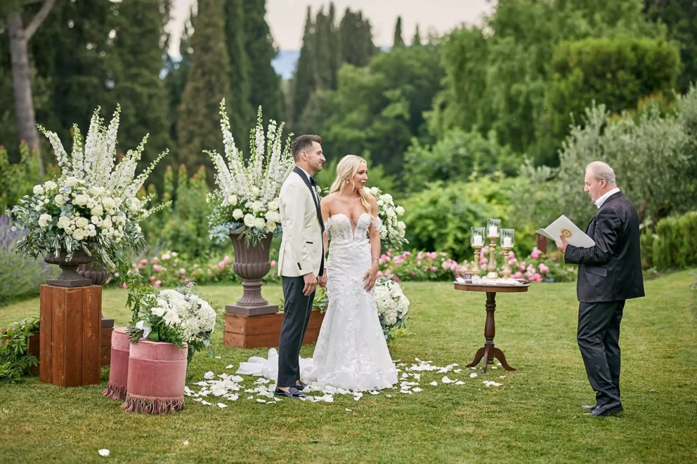 Then, on a private lawn with the rolling hills as their only witness, they saw each other for the first time and exchanged vows from a text written just for them. It was a perfect moment, followed by portraits around the estate and a private dinner prepared by a personal chef. For one day, this historic villa was not a venue. It was their home.