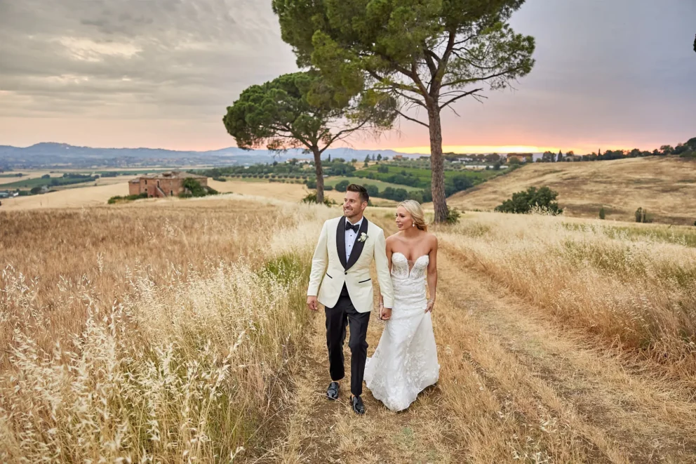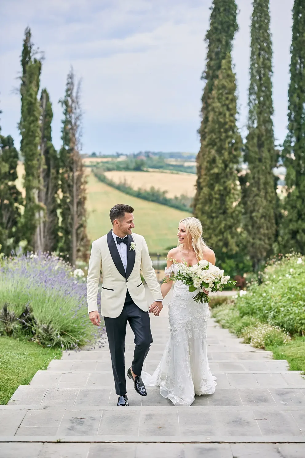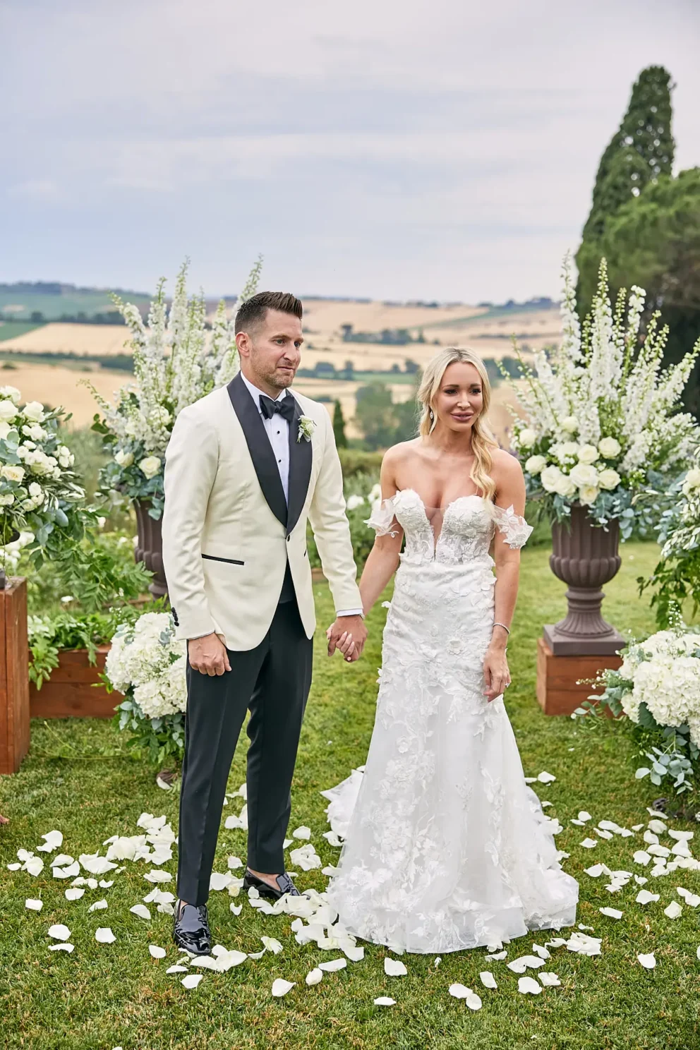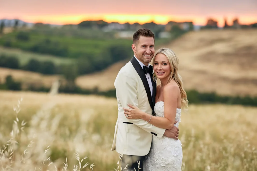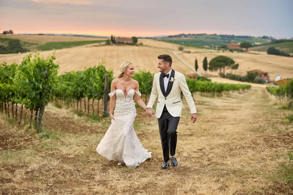 Then, on a private lawn with the rolling hills as their only witness, they saw each other for the first time and exchanged vows from a text written just for them. It was a perfect moment, followed by portraits around the estate and a private dinner prepared by a personal chef. For one day, this historic villa was not a venue. It was their home.